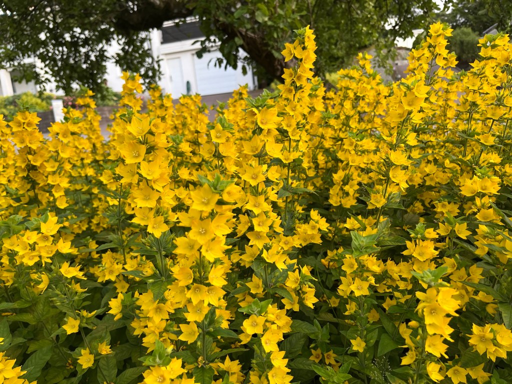 Vi gick en trädgårdsrunda. De har en stor prunkande trädgård som de sköter med bravur. Denna växt heter Praktlysning. Dess latinska namn är Lysimachia punctata. De är jättefina och jag har beundrat dem. Bengt säger att jag ska få några med mig hem. Han behöver rensa ur lite här för tydligen sprider de sig lätt. Yippie! De vill jag gärna ha hemma på Tallkullen. Jag ska få blå bolltistel också. Detta blir roligt.