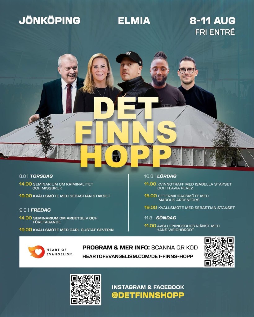 Sebastian Stakest, f d gängkriminell, och flera andra som vuxit upp på livets skuggsida kommer att medverka och berätta hur Jesus har förvandlat deras liv. Jag är glad att få vara en del av detta. Det finns hopp för Sverige och det är detta vi vill förmedla till alla Jönköpingsbor och alla andra.