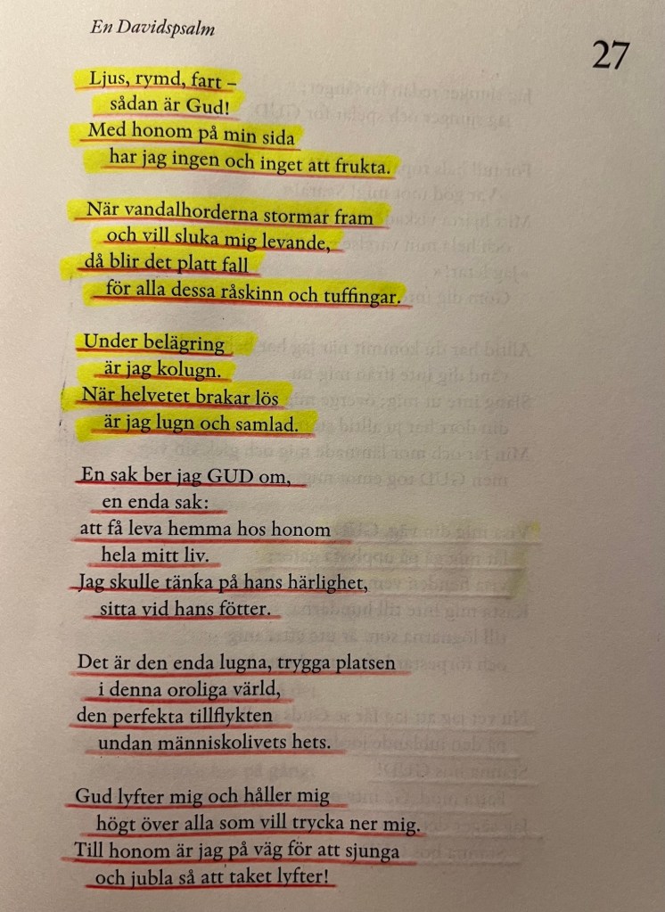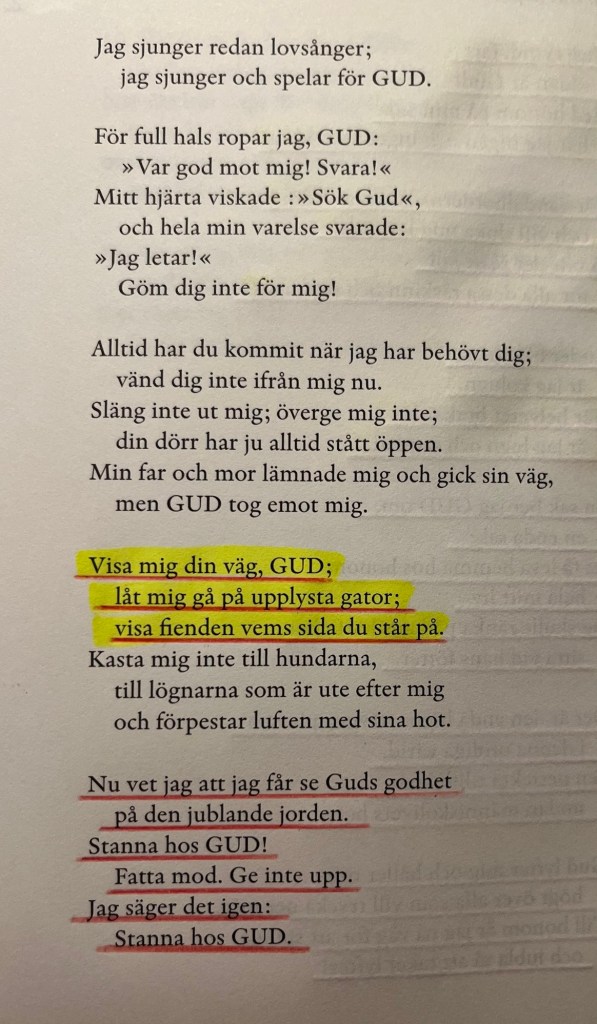 Jag var med om en jobbig grej förra veckan. Jag hade en konfrontation med en person jag inte känner så väl. Jag blev verkligen bekymrad över det bemötande jag fick och personens agerande i ett ärende. Jag bad förstås till Gud om att situationen skulle lösas men smsade också ett antal vänner och bad dem att be för situationen. Då skickade en av mina vänner Psalm 27 som stöd. Jag läste den i The Message som är en modernare översättning av Bibeln. Jag tycker texten är så bra. Jag läste och strök under och även gulmarkerade en del. Jag gillar allt i psalmen men följande ord är så bra: Under belägring är jag kolugn. När helvetet brakar lös är jag lugn och samlad. Man måste förstås göra det man kan för att lösa jobbiga situationer som uppstår men när man känner att man gjort vad man kan då får man överlämna det till Gud. Han är rättvis och på något sätt får man kompensation senare när man blir orättfärdigt behandlad.