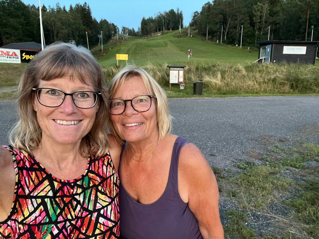 Jag ringde runt och sökte en badkompis och goda vännen Ulla nappade. Hon ville att vi skulle motionera först för hon tränar inför en vandringsresa i Italien så hon föreslog att vi skulle gå uppför Järabacken som är en slalombacke. Jag trodde det skulle vara mycket jobbigare än vad det var. Det gick fort och jag tog backen i ett svep. Sen gick vi en härlig skogspromenad.