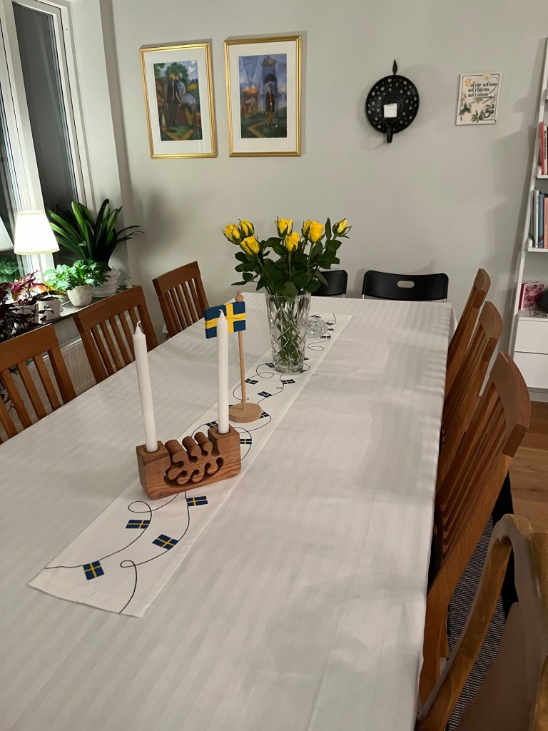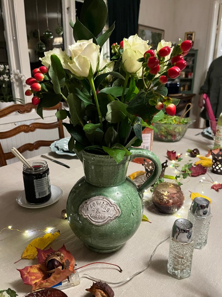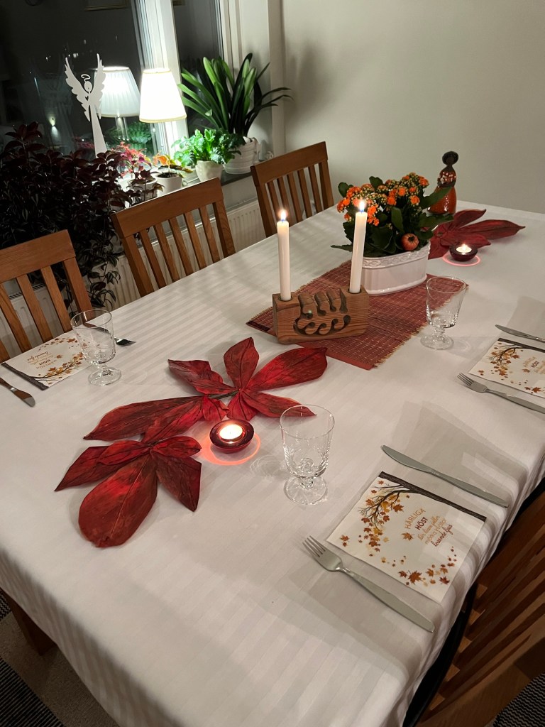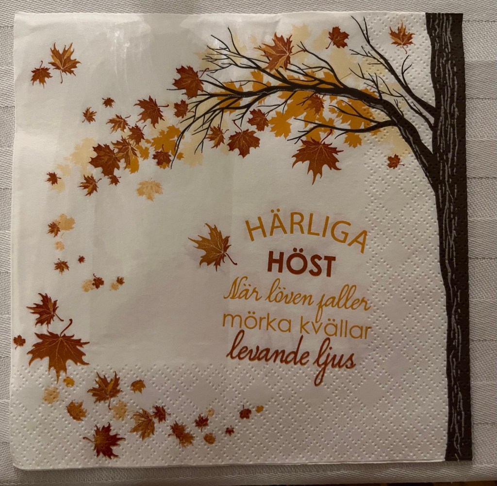 Jag har bjudit hem goda vänner både imorgon kväll och på lördag kväll. Nu har jag dekorerat med de orangea löv jag haft några år. Jag tycker de är färgstarka och klatschiga så de får hänga med några år till. Jag gillar servetterna med höstmotiv och bra text: HÄRLIGA HÖST, När löven faller, mörka kvällar, levande ljus. Nu är det verkligen tid för innemys.