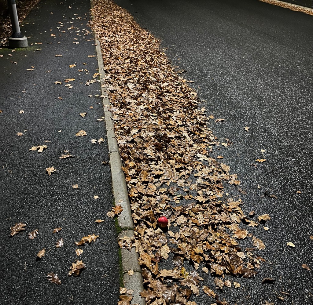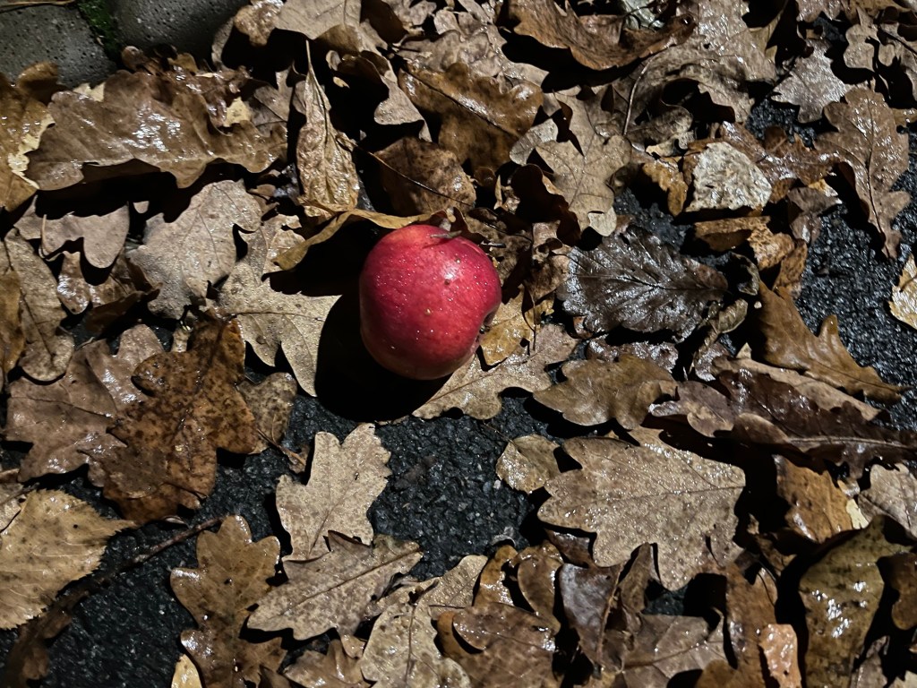 Man kan också ge sig tid att prassla lite i löven med fötterna. Då är det höst. Ikväll låg det ett äpple bland löven. Ja, äpple är också en symbol för hösten.