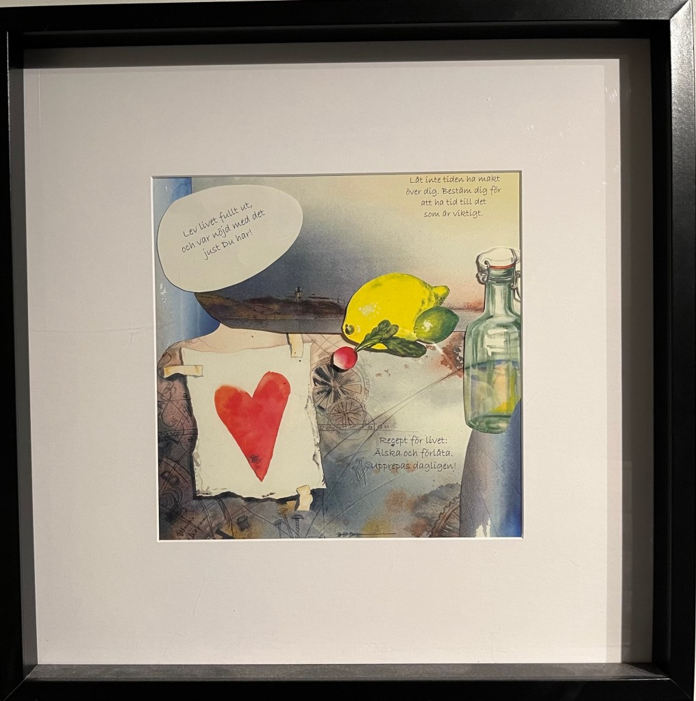 Jag gillar aforismer och tänkvärda ord. Igår kväll när jag var hemma hos Monica och Åke fick jag se några nya tavlor och här är en av dem. Monica har gjort den själv. Hon har använt gamla almanackor och klippt ihop olika bilder och texter.