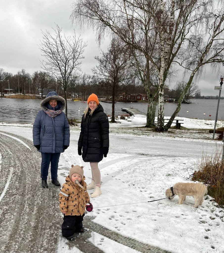 Pia och jag var idag bjudna till Sabine, Lasse och Noa för att äta lunch. Vi hann med både förmiddagskaffe, lunch och kaffe med efterrätt. De bor vackert i Djursvik nära vattnet. Vi tog en promenad i vintervädret. Gräsänderna var också ute och promenerade.