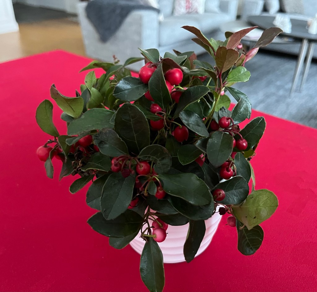 Jag fick denna växt av en kompis som har besökt mig. Den heter Tuvvaktelbär el Gaultheria procumbens på latin. Den kallas också tebär och är en buske i släktet vaktelbär och familjen ljungväxter. Jag har inte haft en sådan tidigare.