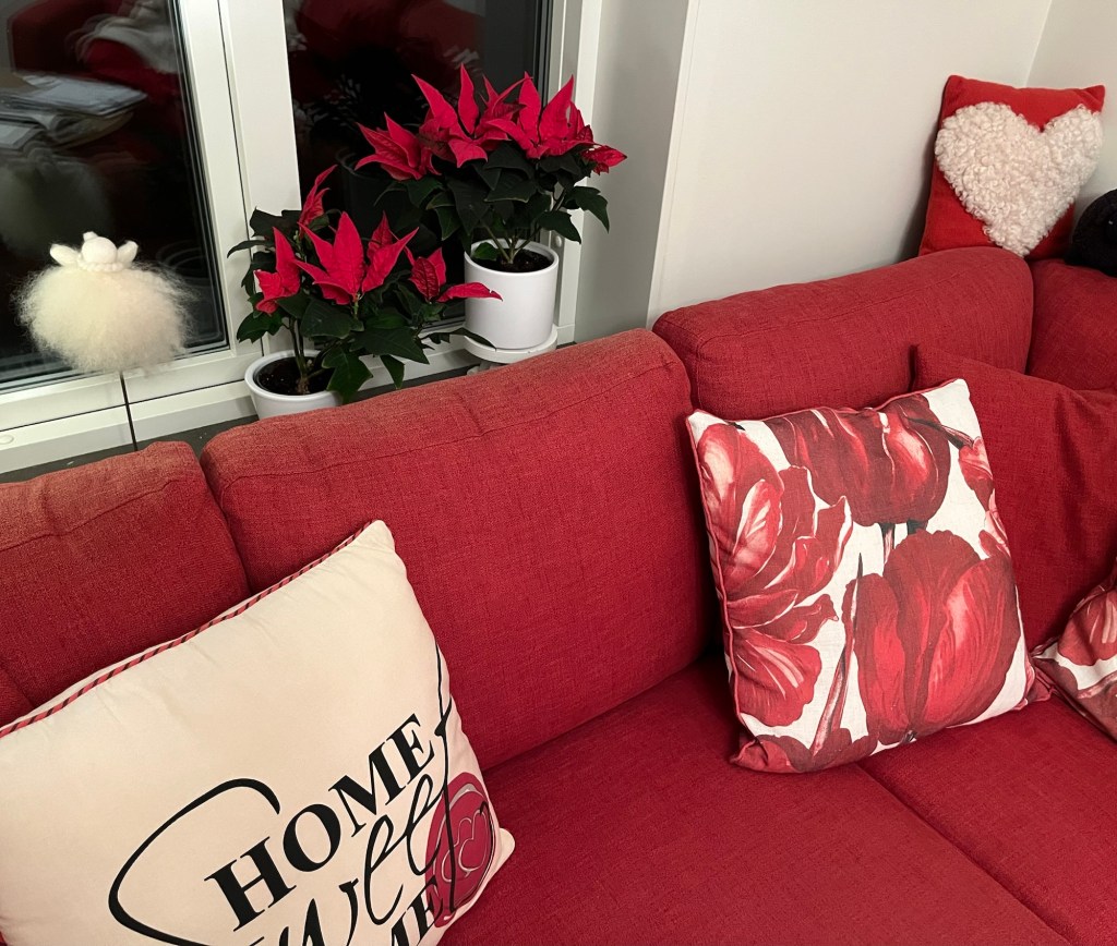 Julen är utstädad men mina röda julstjärnor lever vidare. Jag har placerat dem i mitt röda rum där de passar ypperligt. Jag brukar köpa julstjärnor av märket Jester för jag tycker de är mycket tåliga. De kommer att sprida glädje lång tid framöver i mitt TV-rum för här trivs de fint. Glädje!