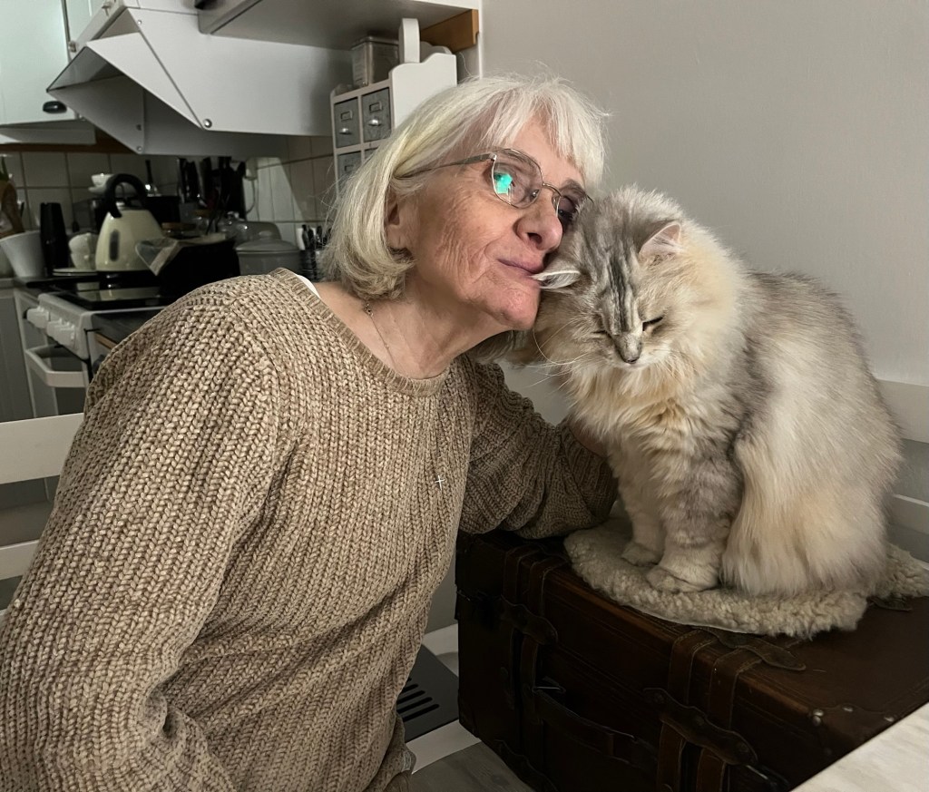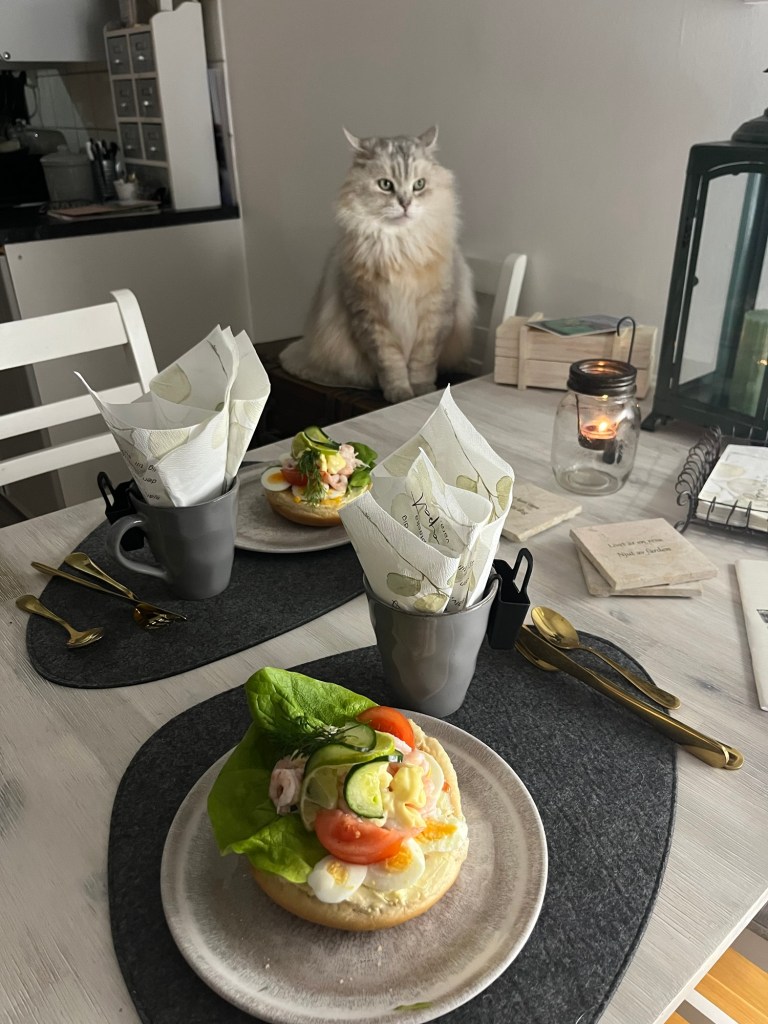 Ewa har en katt som är hennes skatt. 💙 Han heter Musse och ville gärna vara med på ett hörn när vi skulle äta räksmörgås.