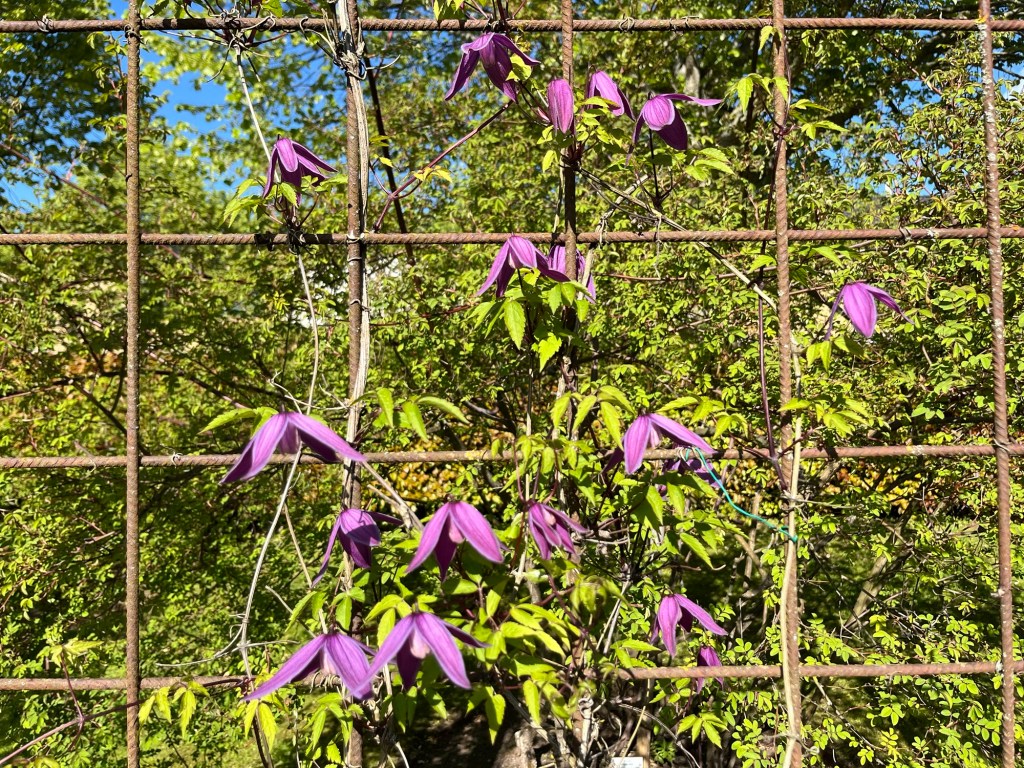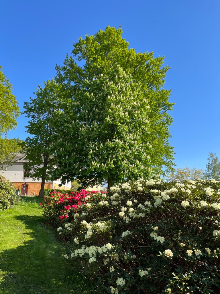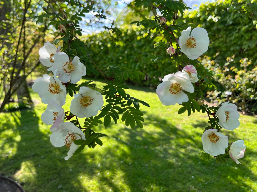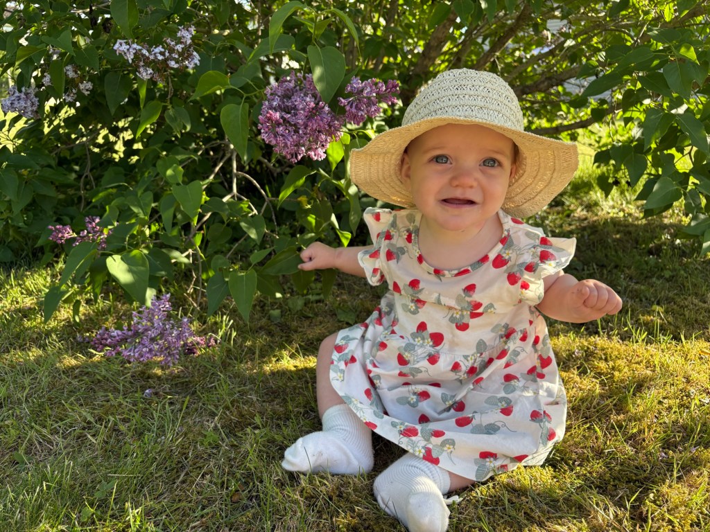 Ljuvliga lilla Saga poserar så fint vid syrénbusken.