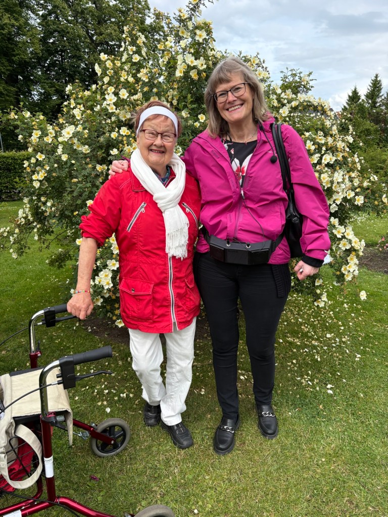 När guidningen var slut träffade jag en trevlig kvinna. Hon kom fram och började prata med mig och vi fick ett mycket fint möte. Ni ser oss här framför busken med vackra gula rosor. Det är en Spinosissimaros som heter Gutan.