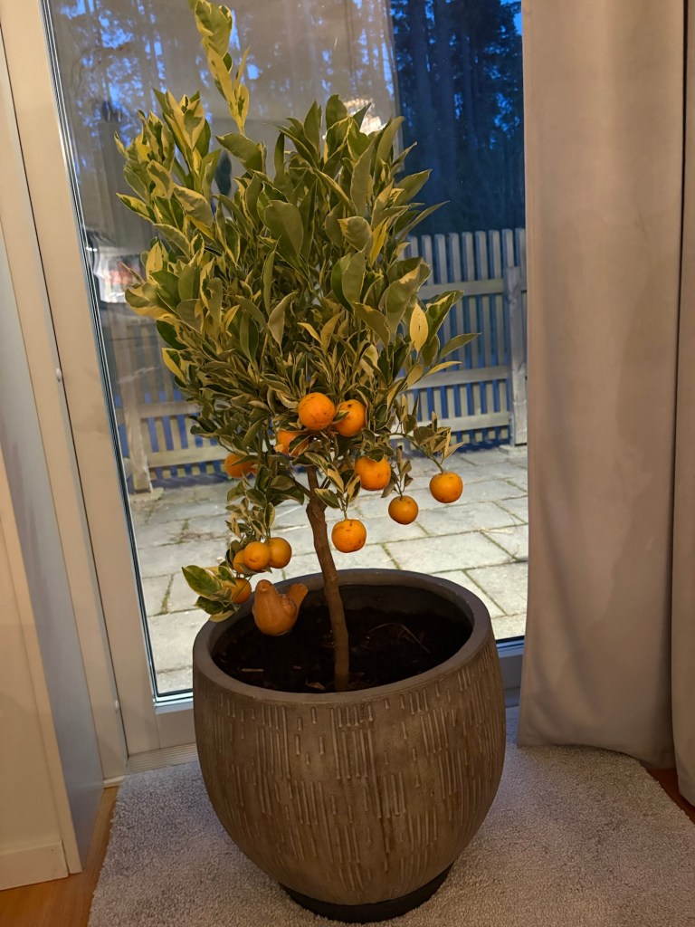 Nu har jag tagit in Dvärgapelsinen/Kalamondinen jag fick i somras. Den klarar inte frost utan ska helst placeras ljust i en sval miljö på ca 5 – 10 grader. Jag har ingen sådan plats så jag kommer nog att placera den på bottenvåningen, kanske i mitt sovrum. Man kan med fördel använda växtbelysning under den mörka årstiden. Den ska bara vattnas lite grand men jorden får inte torka ut helt. Ingen näring ska tillföras under vintern.
