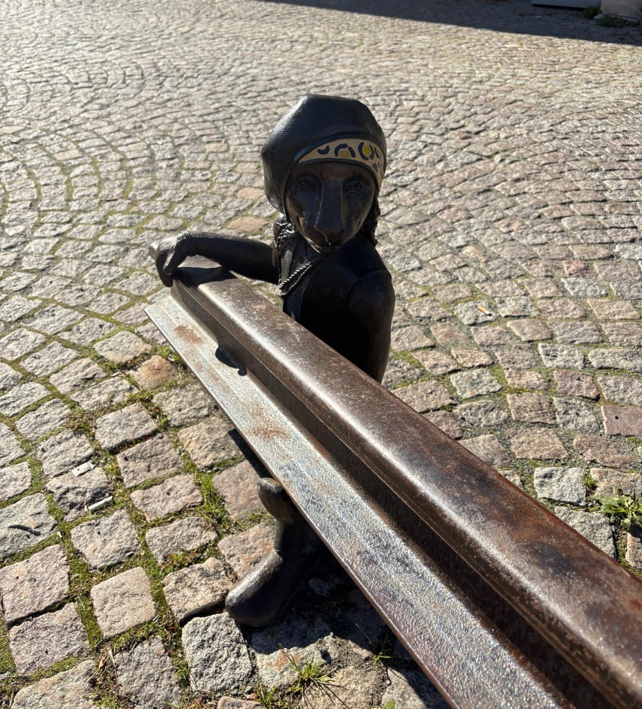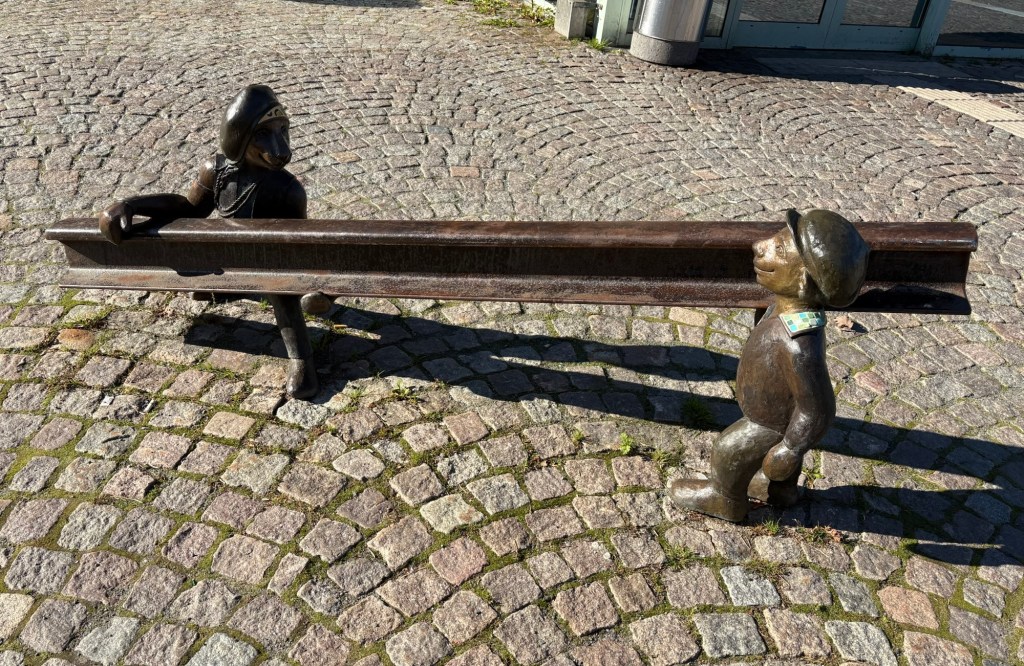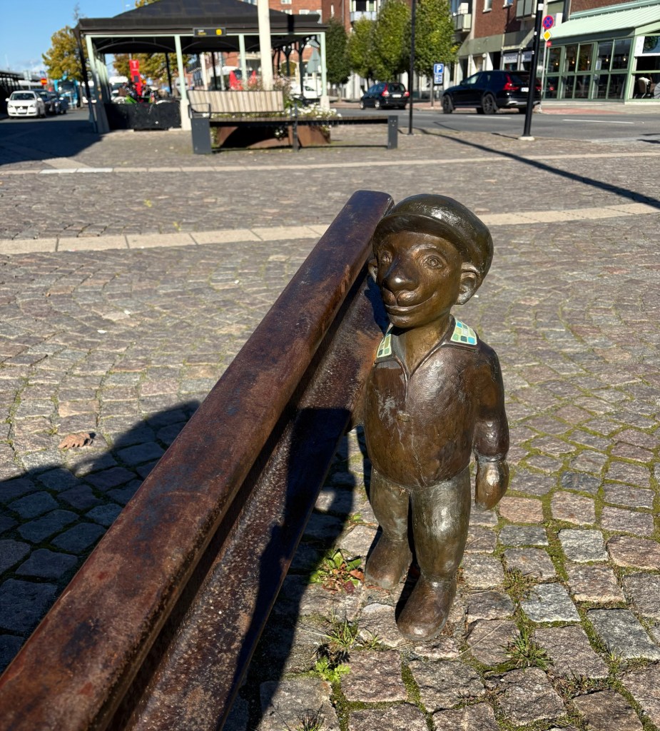 Utanför Nässjö Centralstation fick jag se denna söta skulptur. Det är ett konstverk som kallas Rallarrock. Det är en rallare och en rockare som tillsammans bär en bit tågräls.