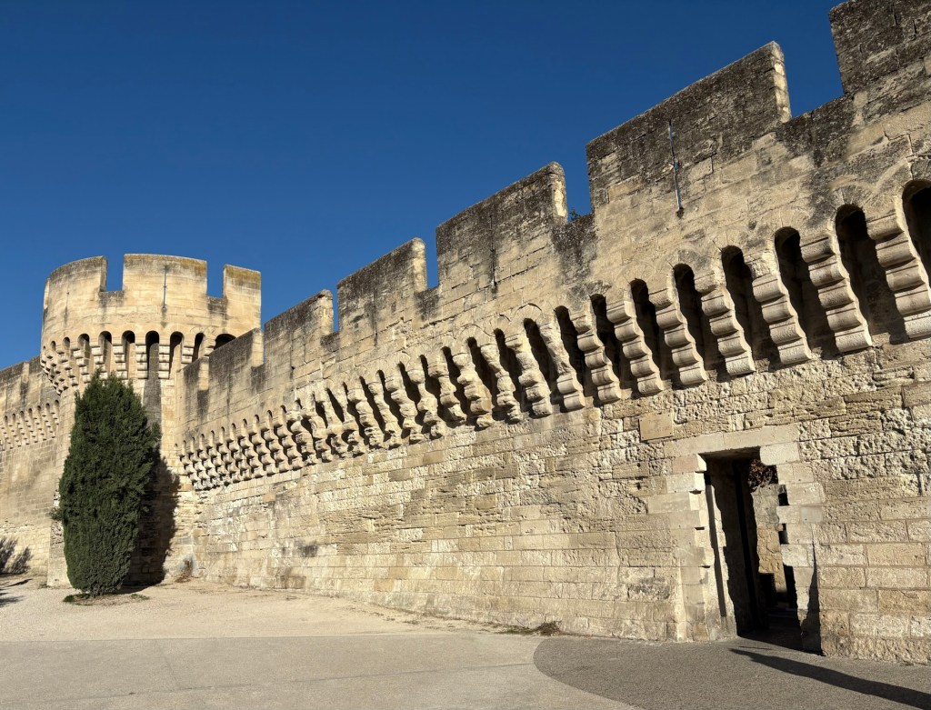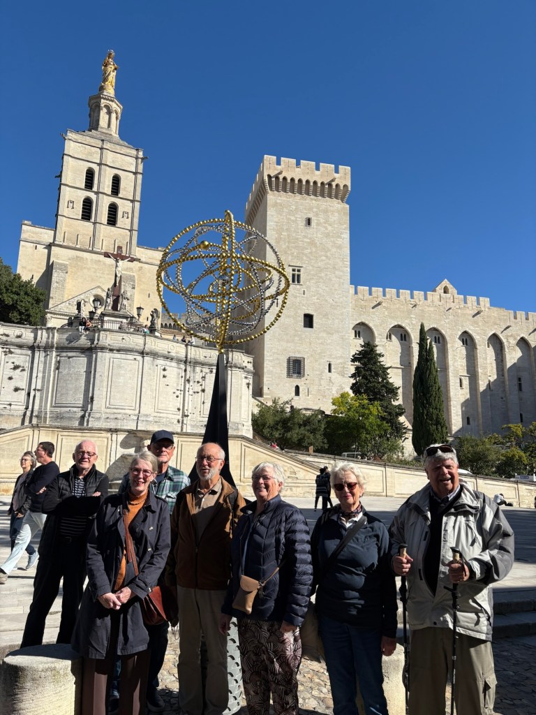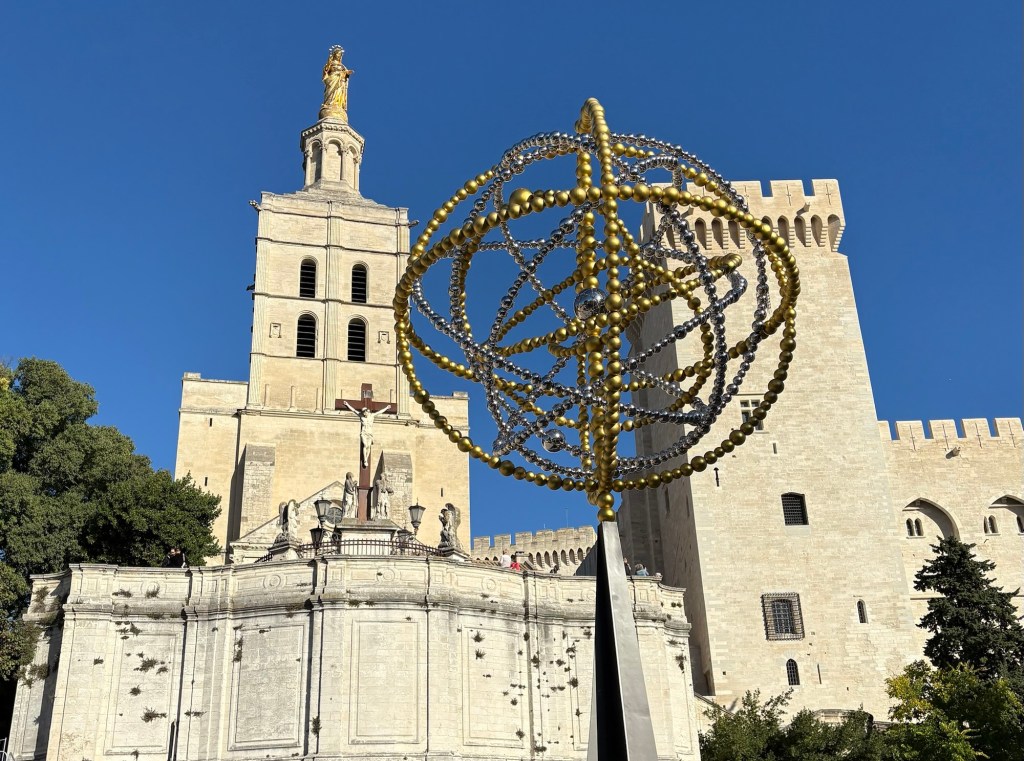 Till vänster ser vi katedralen Notre-Dame des Doms med den förgyllda Mariastatyn högst upp på klocktornet. Statyn installerades 1859 och har alltså funnits där länge nu. Jungru Maria vakar över Avignon och beskyddar staden och dess invånare.