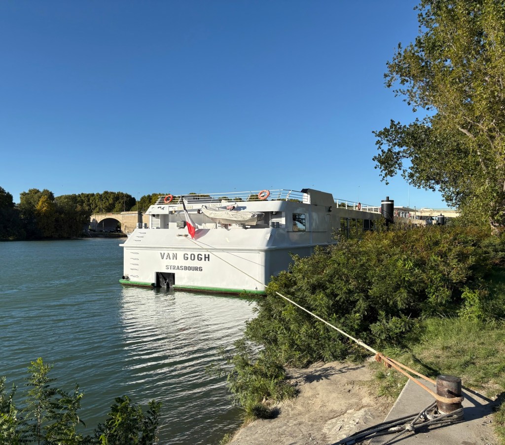 Runt Avignons gamla stadsdel löper den nästan 4,5 km långa ringmuren. Den har 39 torn och 7 portar. Vi ser vår fina båt, Ms Van Gogh som ligger så fint på Rhônefloden.