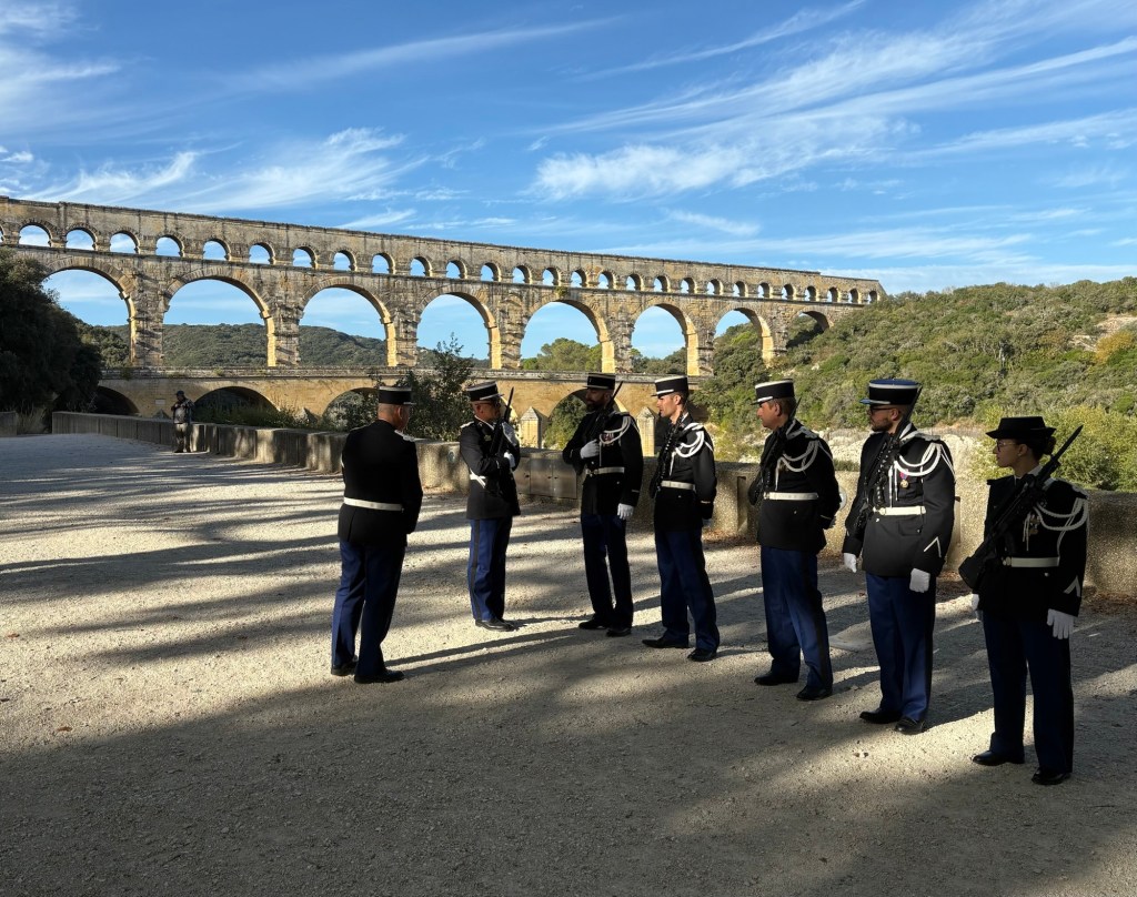 Jag vill visa hur pampigt det var när vi besökte Pont du Gard idag. Gendarmeriet (militärpolisen) var där och hade en ceremoni. Att vara vid Pont du Gard är alltid mäktigt och nu blev det extra stämningsfullt. Akvedukten anses vara ett av de bäst bevarade exemplen på romersk ingenjörskonst. Den byggdes under det första århundradet e Kr och är den mest kända delen av den 50 km långa akvedukt som försåg staden Nîmes med vatten under ca 500 år. Den startade vid källan i Uzès. 🇫🇷 ❤️ 💙