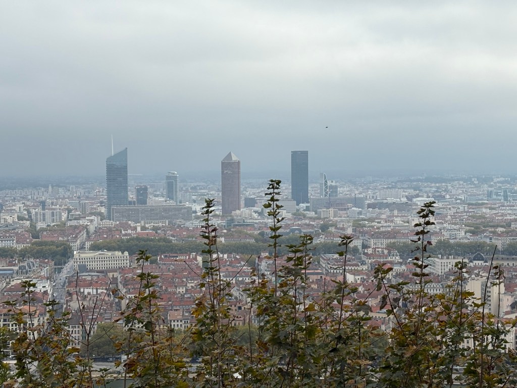 Det var lite disigt idag men jag tycker att man kunde urskilja de höga byggnaderna väldigt bra. Byggnaden i mitten kallas Tour Part-Dieu och ser ut som en blyertspenna. På de tio översta våningarna huserar Radisson Blu Hotel. Byggnaden ligger i området Part-Dieu nära järnvägsstationen Part-Dieu. Den ligger också nära Les Halles de Lyon Paul Bocuse, saluhallen vi besökte tidigare på förmiddagen.
