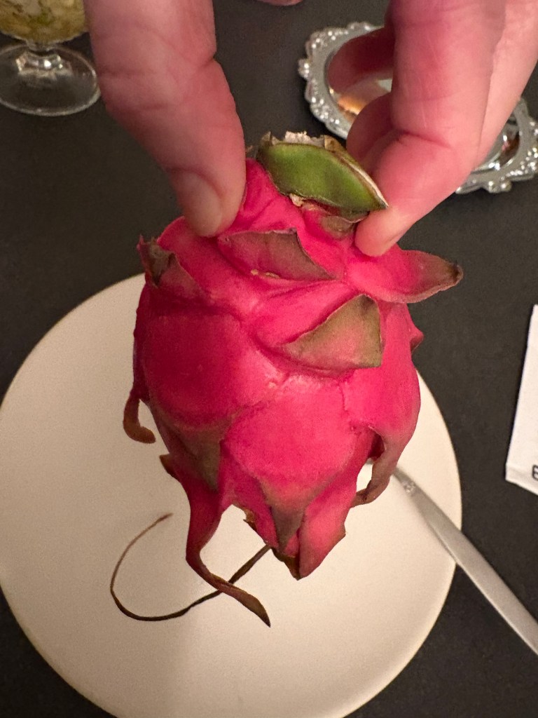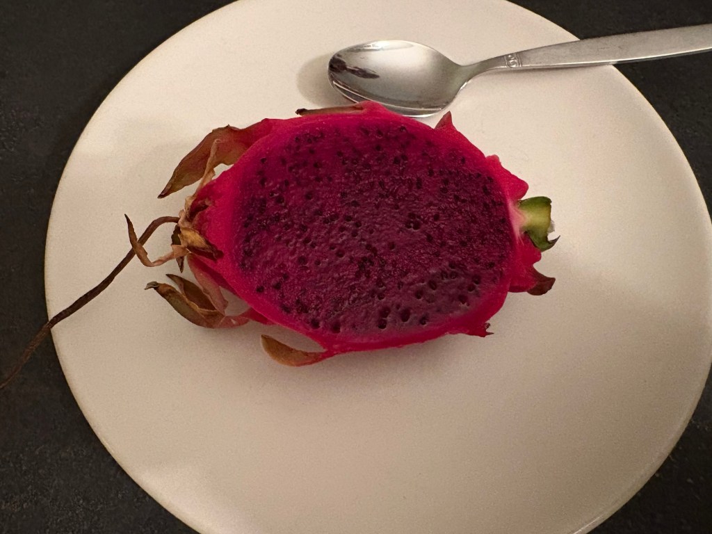 Hon hade med sig olika frukter bl a denna drakfrukt som vi mumsade på. Jag tror inte jag har ätit drakfrukt tidigare så det var en trevlig upplevelse. Den smakade egentligen inte så mycket men färgen tilltalade mig. Den kallas också pitaya.