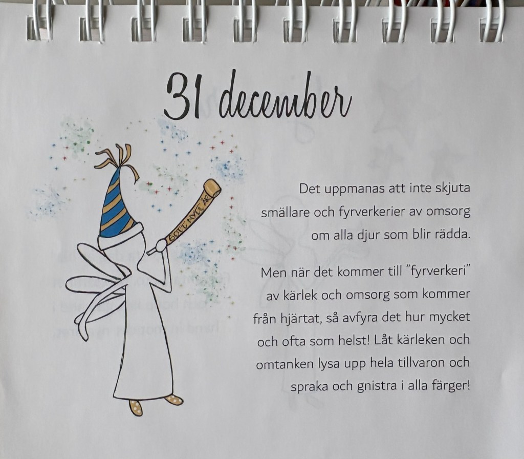 Det uppmanas att inte skjuta smällare och fyrverkerier av omsorg om alla djur som blir rädda. Men när det kommer till ”fyrverkeri” av kärlek och omsorg som kommer från hjärtat, så avfyra det hur mycket och ofta som helst! Låt kärleken och omtanken lysa upp hela tillvaron och spraka och gnistra i alla färger!