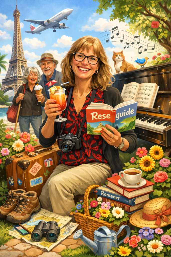 Jag lät AI göra en bild på mig genom att skicka ”honom” ett foto och sen berätta om mina intressen. Jag tycker bilden blev kul. 😄 Den stämmer bra med det jag beskrev: blommor, vänner, pianospel och sång, resor, är reseledare, promenader, böcker och min trädgård. Jag tycker AI verkligen fångade detta på ett härligt sätt. Jag blir glad av bilden. Du kan också göra detta med ChatGPT. Jag lade upp denna bild på Facebook igår och jag har sett att flera andra gjort samma sak.