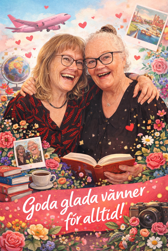 Idag fick jag några fina hälsningar via sms och då ville jag naturligtvis skicka något tillbaka. Jag tog hjälp av AI för att göra en trevlig bild av mig och min vän Yvonne. Jag skickade två separata bilder på oss och skrev vilken text jag ville ha samt några av våra gemensamma intressen och att vi har kul ihop. Bilden ser ni ovan. Jag tycker vi är oss lika och bilden är underbar. Det är bra att boosta vänskapen. Vänner gör livet rikt och jag är enormt tacksam för mina goda vänner.