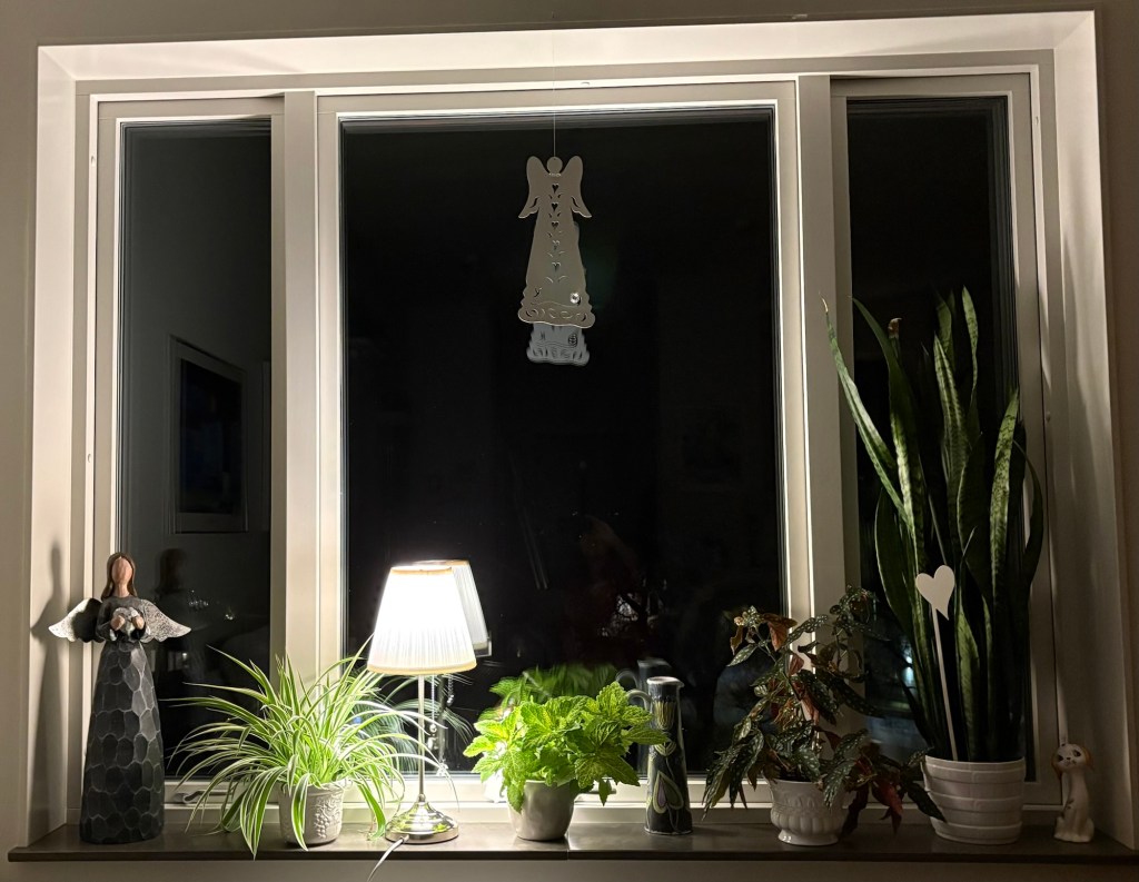 När jag kom hem testade jag lite olika platser att ställa den på och har nu kommit fram till att den får pryda mitt fönster. Det blev riktigt mysigt och änglalikt. Nu njuter jag.