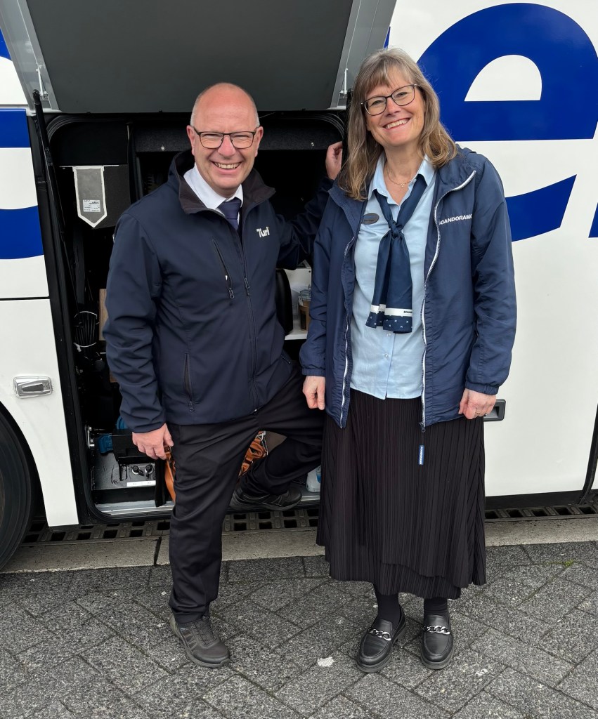 Samarbetet med min danske chaufför Michael har gått ypperligt. Han är en mycket trevlig person som kör tryggt och säkert. Jag känner mig oerhört tacksam och glad. Här ser ni oss efter förmiddagsrasten då vi serverat resans sista kaffe ur busscaféet.