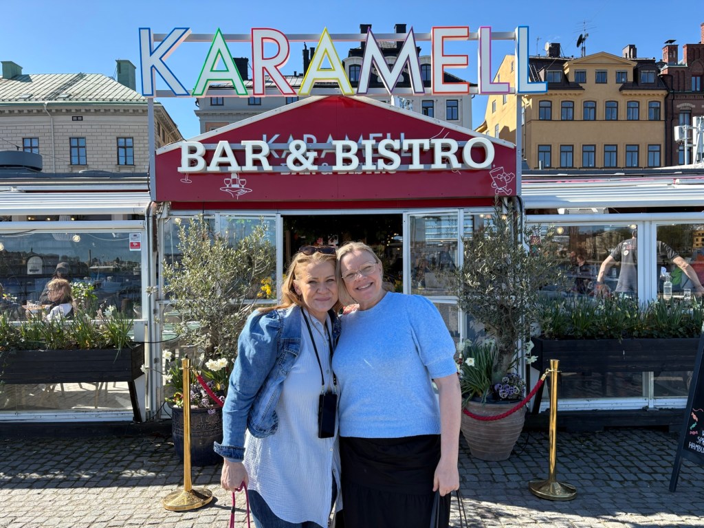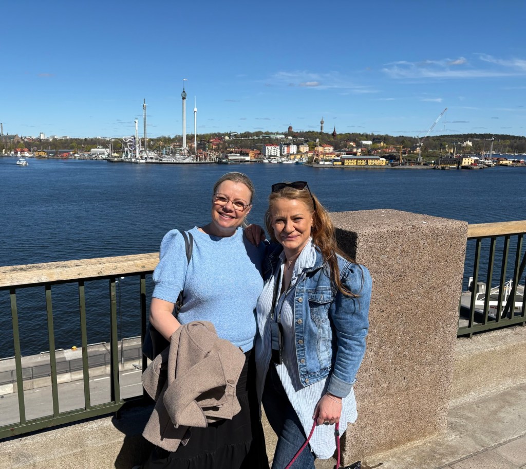 Hon bor på Södermalm så vi promenerade ner till stan. Här ser vi Linda och Pamela med utsikt över Djurgården.