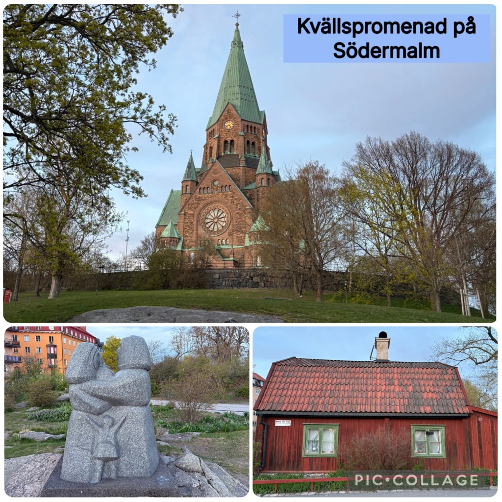 Efter en välbehövlig tupplur, på ca en timma för min del, tog vi en kvällspromenad i området. Jag njöt i fulla drag. Jag har inte promenerat här tidigare så för mig blev det en ny fin upplevelse. Vi passerade Sofia kyrka som tillhör en av de fyra församlingarna på Södermalm.