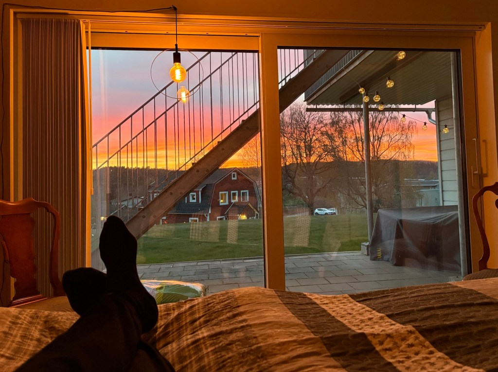 Jag tog en kvällspromenad och lade mig sen i sängen och pratade i telefon. När det började skymma fascinerades jag av den vackra kvällshimlen. Det är så rofyllt att ligga där och titta ut. Jag kände en sådan härlig frid och ro.