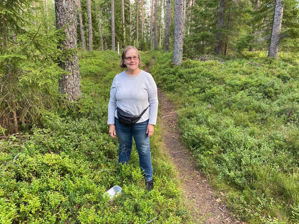 Min vän Monica Rosendal och jag hade bestämt att vi skulle träffas kl. 16.10 i Taberg för att ge oss iväg ut i skogen. Under dagen hörde Monica av sig och undrade om vi inte skulle åka och bada istället. Hon sa att det var 30 grader varmt idag. Även om jag älskar att bada så valde jag att åka ut i blåbärsskogen för jag vill ju fylla min nya frysbox med dessa nyttiga bär. Monica följde med till skogen. När vi möttes i Taberg ösregnade det och det hade tydligen regnat ett tag där. Jag sa att jag trodde det var lokalt över Taberg för jag tyckte det såg ljusare ut över Månsarp. Vi styrde kosan till Månsarp och när vi kom dit var det regnfritt. Ljuva lycka! Vi satte igång att repa de nyttiga bären på direkten. Det kom några regnstänk vid ett par tillfällen men inget som störde.