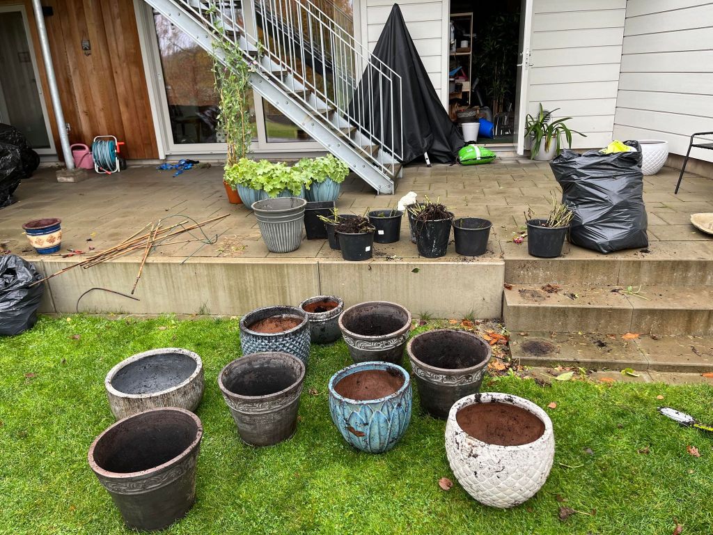 Nu är det snyggt och iordninggjort här. Krukorna ska få torka och sen ska jag placera så många jag kan under sofforna under överdragen. Alla är frosttåliga vilket är perfekt för jag skulle inte få plats med alla i förrådet.