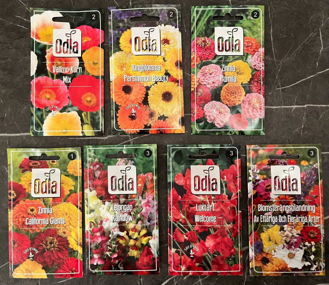 Jag kunde inte motstå denna färgprakt. Det är vallmo, ringblomma, två olika sorters zinnia, lejongap, luktärt och blomsterängsblandning. Jag har nog inte plats för allt men gör ett försök i alla fall. Det får växa hej vilt. Blommor bereder så mycket glädje. Lycka!