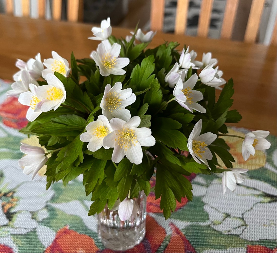 Jag har plockat vitsippor och njuter av denna ljuvliga bukett. Jag kan nästan inte se mig mätt. De är så fina. Jag säger som Ernst: I det enkla bor det vackra…om man nu kan kalla vitsippor enkla. De är en del av Guds fantastiska skapelse. Vitsippa heter Anemone Nemorosa på latin, Wood Anemone på engelska och Anémone des bois på franska (skogsanemon både på engelska och franska).