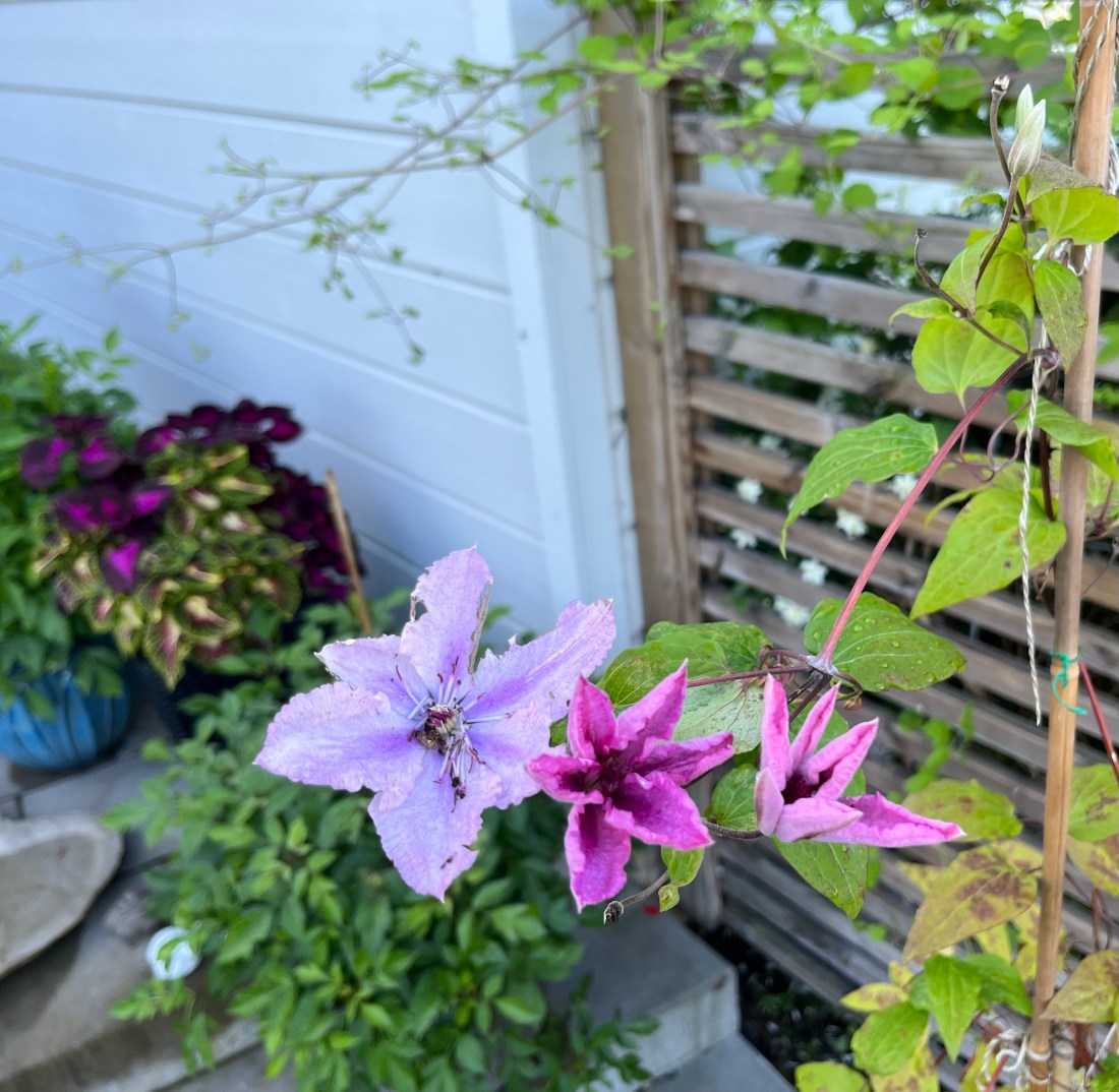 Jag har två olika sorters klematis i mitt blomland. Det är ingen fart på dem alls tyvärr och det beror säkert på mig själv. Jag vet inte vad jag har gjort för fel. Jag gödslar och vattnar när det behövs men ändå är det skralt med blommor. Den ena har blommat lite grand och nu är det dags för den andra och den ger mig just nu tre blommor. Alltid något att glädjas åt!
