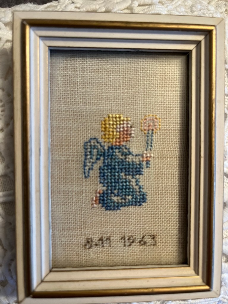 Idag kl 09.00 var det exakt 60 år sen jag såg dagens ljus. Jag är glad att jag har fått leva så här länge och jag hoppas att få leva många år framöver. Denna lilla tavla fick mamma av sin väninna Gerd när jag föddes. Jag har den nu vid mitt nattduksbord. Den är söt och texten på baksidan betyder mycket för mig. Det är roligt med dessa små minnen från förr.