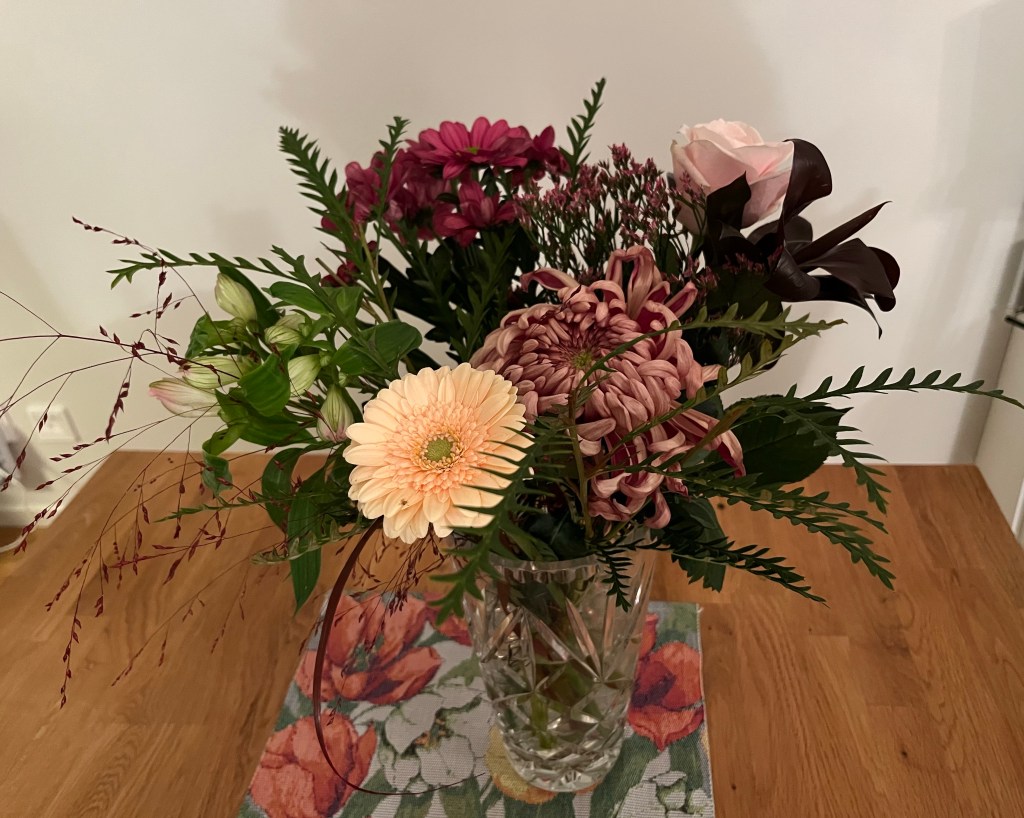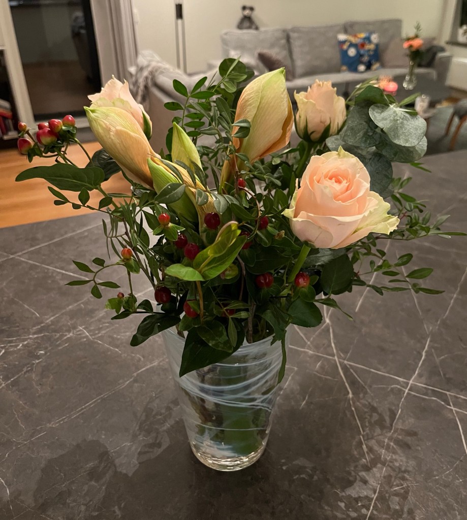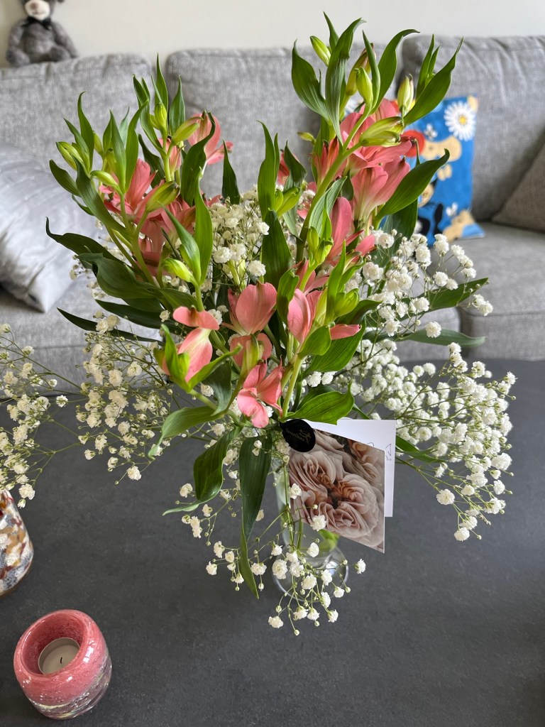 Jag fick också ett blomsterbud. Det var mina goda vänner Helen och Magnus från Varberg som hade skickat blommor. Nu njuter jag av detta vackra. På lördag blir det fest här hemma hos mig.