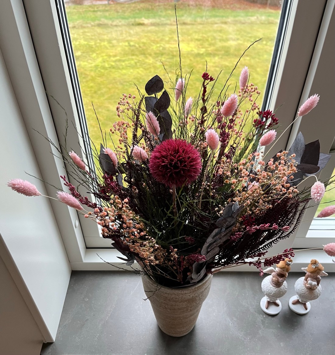 Jag har lagt upp bilder på underbara blombuketter jag fick när jag fyllde år. Jag har också fått en bukett torkade blommor som kommer att bestå, i alla fall i sex månader. Det stod på en lapp att dessa blommor håller sig fina i ett halvår men jag räknar med att ha dem kvar längre.