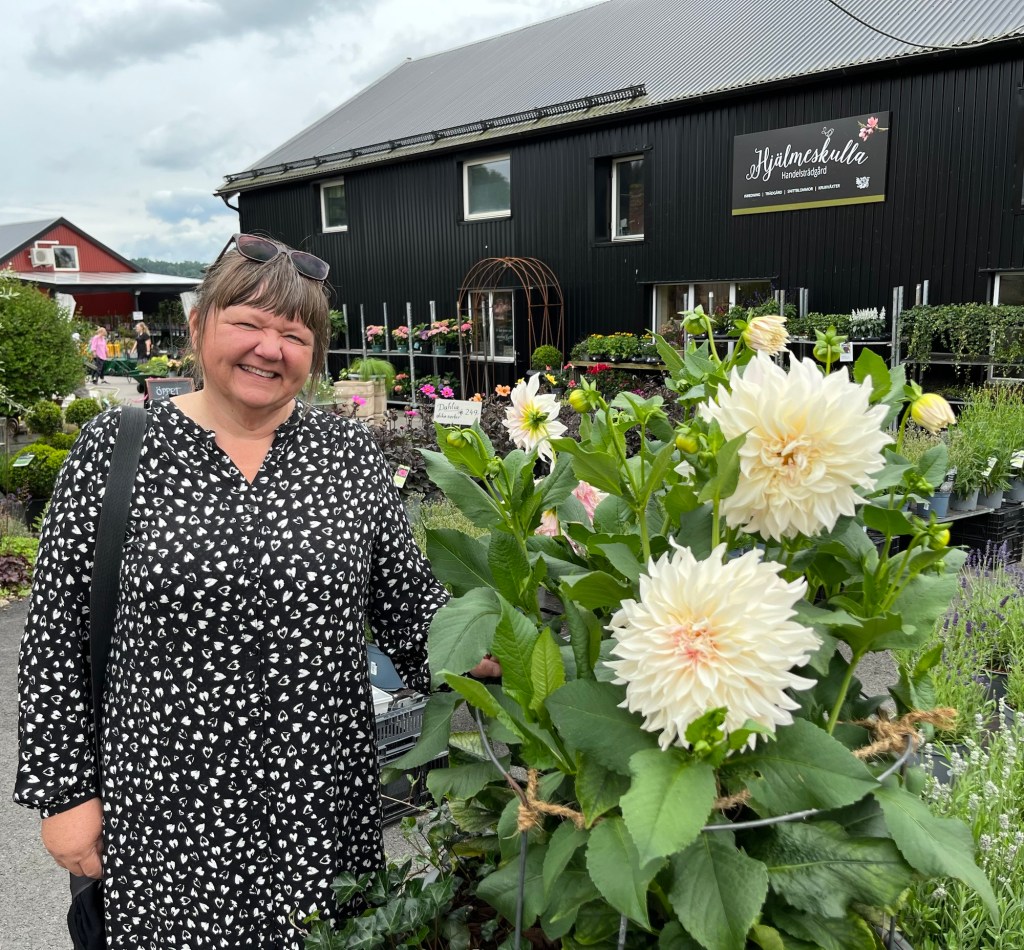 Vi sov länge och åt en god frukost ute i trädgården. Sen åkte Mia och jag till ett par handelsträdgårdar. Här har vi kommit till Hjälmeskulla handelsträdgård i Kungsbacka. Där hade vi en jättefin stund när vi vandrade runt bland alla växter. Titta så fin dahlia!