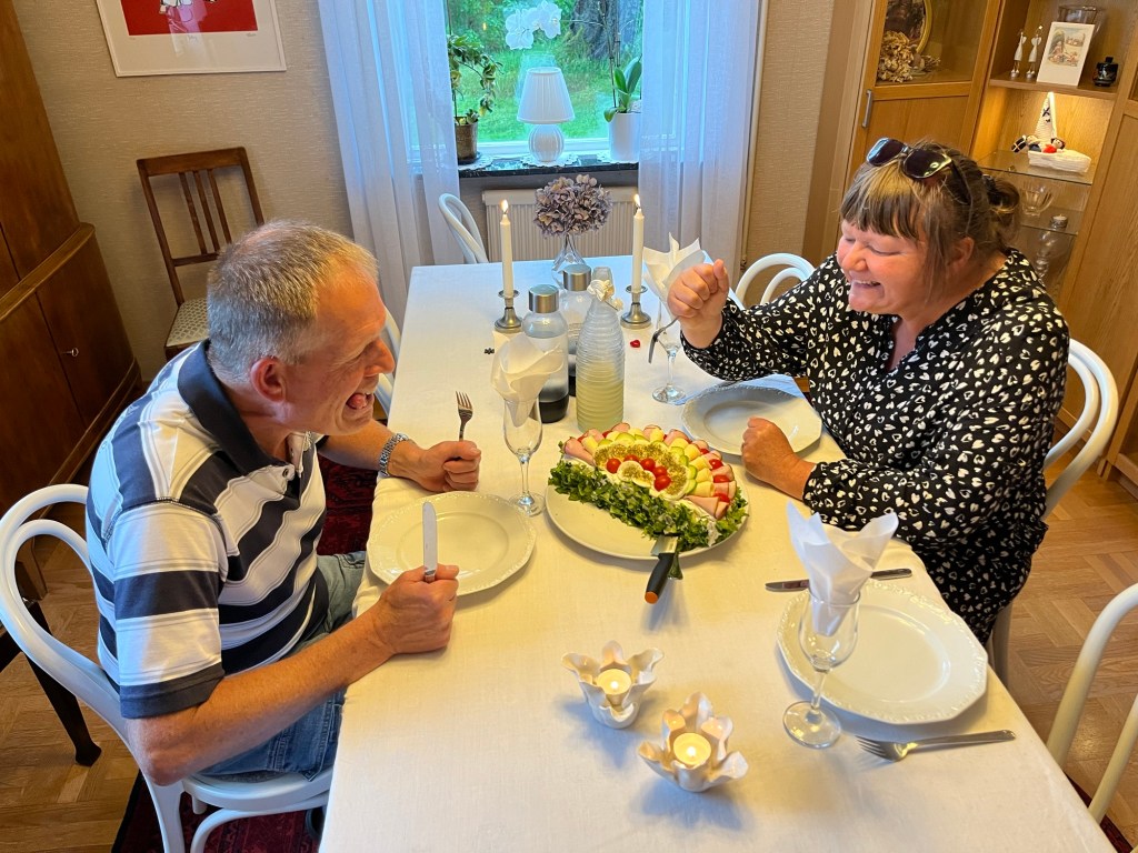 Rätt som det var medan vi åt började mina vänner att hålla tal. De var så snälla, roliga och kärleksfulla. Bengt och Mia läser något trevligt och uppmuntrande de diktat.