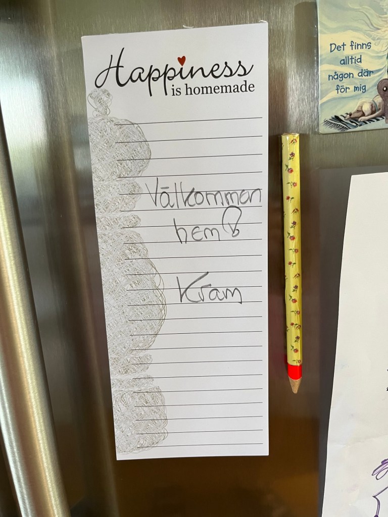 Min goda vän Yvonne har vattnat mina växter ett par gånger då jag varit i Frankrike. Idag när jag kom hem fick jag se denna fina bukett som hon ställt på bordet! Det stod en trevlig välkomsthälsning på kortet! Så gulligt av henne! Det är ju jag som ska tacka henne. Jag har köpt henne en liten present i Frankrike. Jag hittade denna lilla hälsning på kylskåpet också.