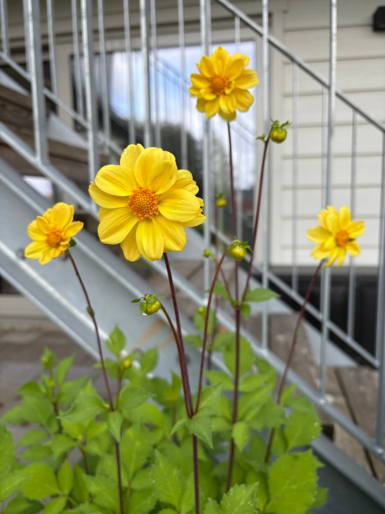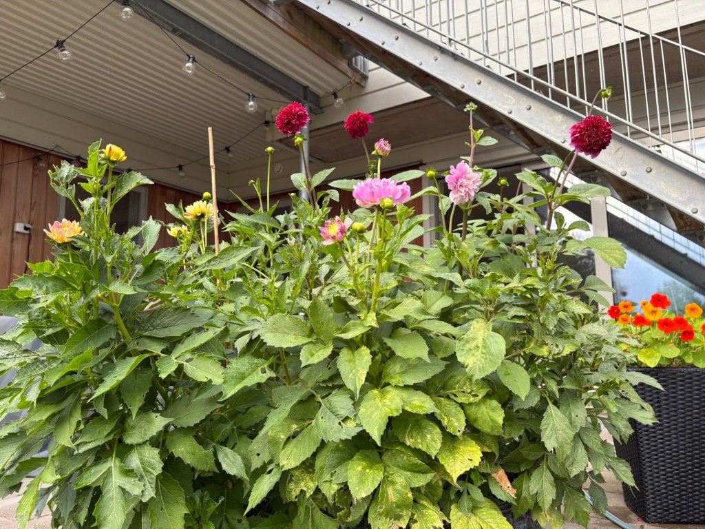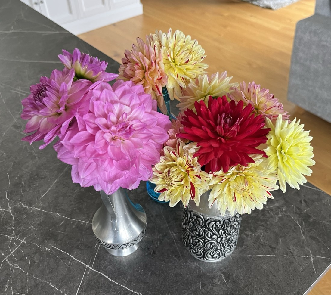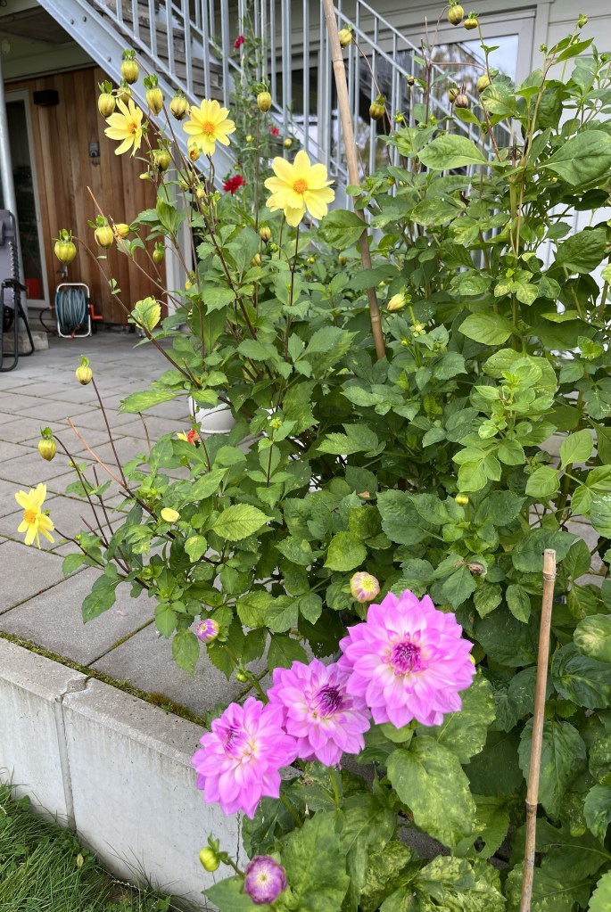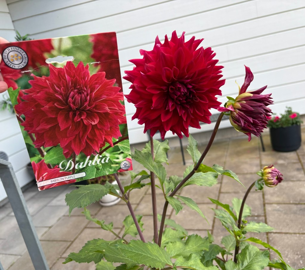 Jag älskar mina dahlior så idag blir det en dahliaboost. Den vänstra dahlian var en av de första jag köpte för några år sen och jag tycker den är läcker. Förra året blev det inte några sådana blommor och jag vet varför. När jag skulle packa in mina dahlior efter första frosten förra hösten upptäckte jag att jag hade glömt att plantera några lökar och det måste ha varit just dessa. Jag petade ner dem i jorden i våras och nu blommar de för fullt. Vilken lycka!