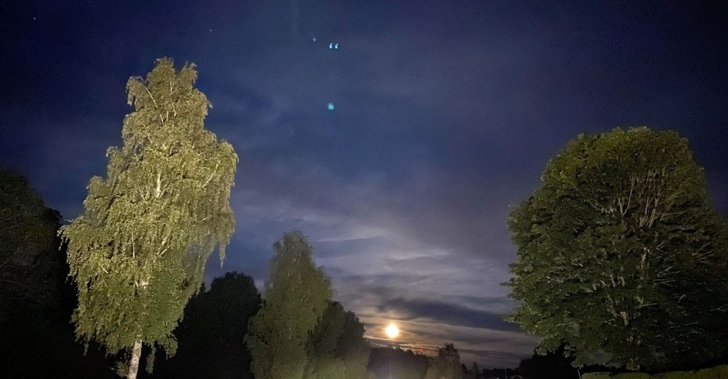 Jag har haft en jättetrevlig kväll hos min goda vän Yvonne. Hon bjöd på god mat och fika. Mot slutet av kvällen satt hon bara och tittade ut genom balkongdörren. Vad hände? – Du måste se månen, sa hon. Ja, det var verkligen en måne som heter duga. Det är svårt att fånga verkligheten på bild men jag gjorde ett försök.