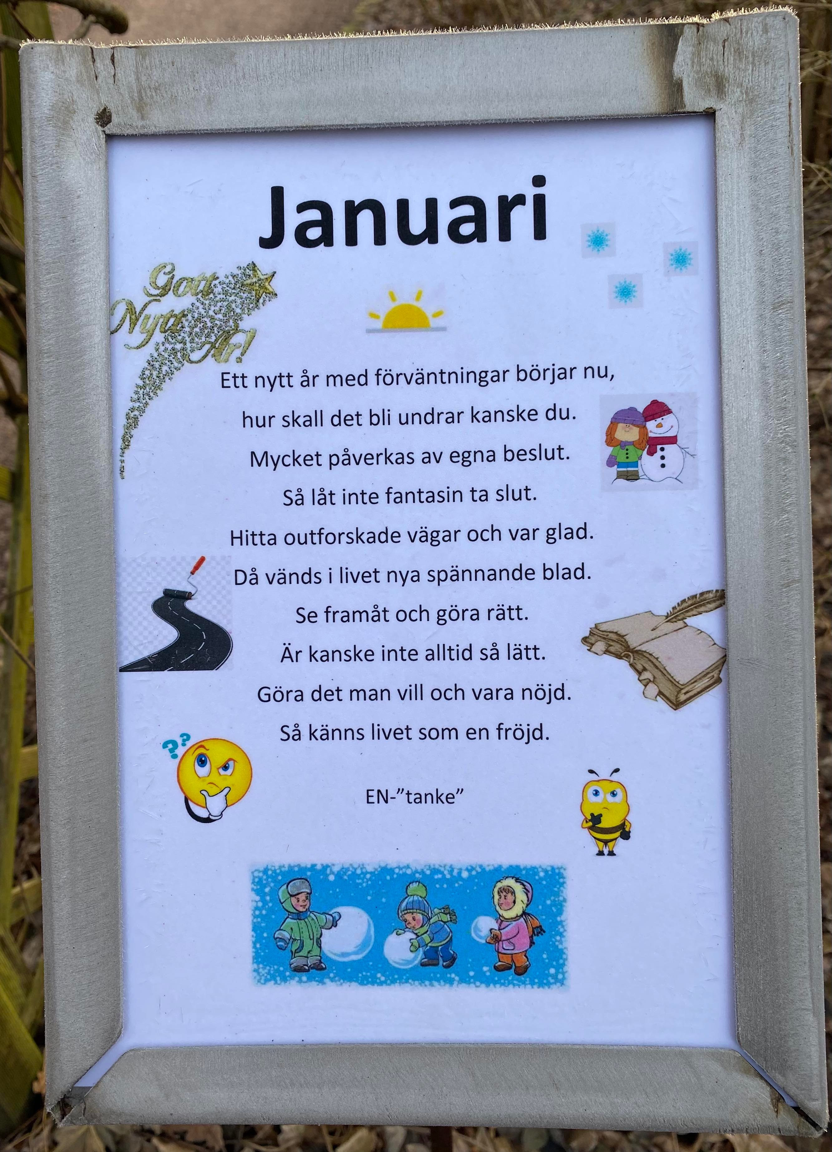 Texten på tavlan lyder: Ett nytt år med förväntningar börjar nu, hur skall det bli undrar kanske du. Mycket påverkas av egna beslut. Så låt inte fantasin ta slut. Hitta outforskade vägar och var glad. Då vänds i livet nya spännande blad. Se framåt och göra rätt. Är kanske inte alltid så lätt. Göra det man vill och vara nöjd. Så känns livet som en fröjd. EN-”tanke”