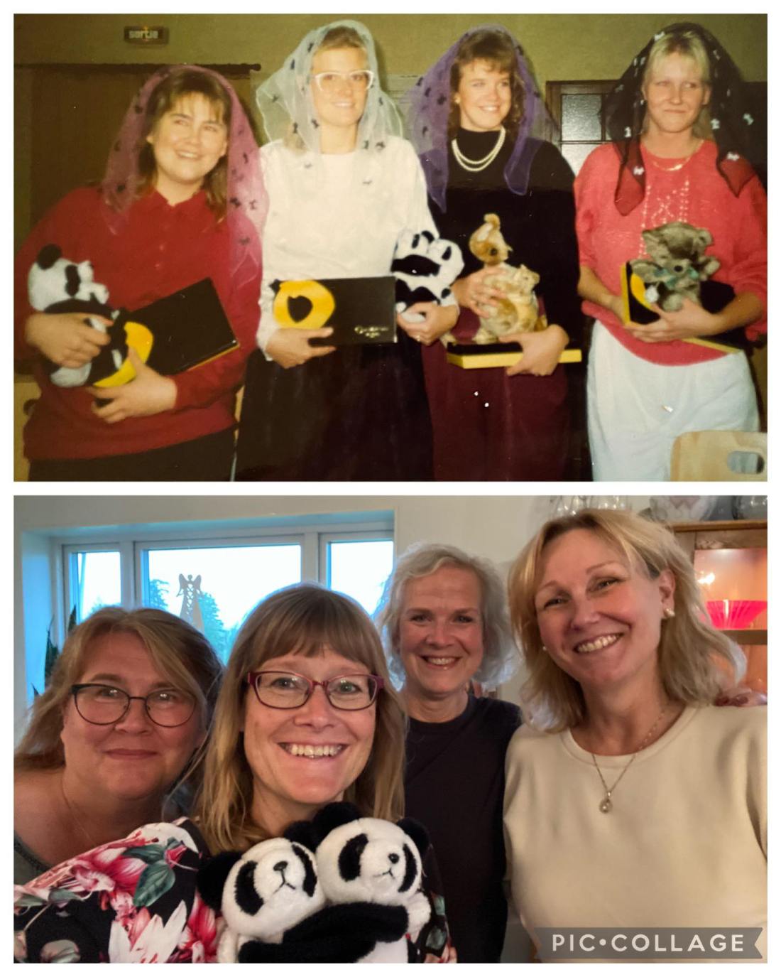 När vi bodde i Frankrike blev vi ofta kallade Les quatre filles suédoises (de fyra svenska flickorna). Det är nästan 34 år mellan bilderna nedan. Här fick vi avskedspresenter av vänner i församlingen. De små pandorna har jag fortfarande kvar. De ligger så fint på sängen i gästrummet.