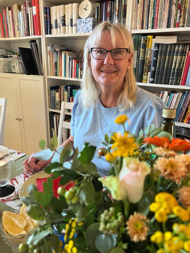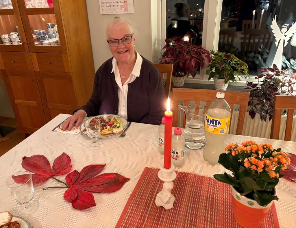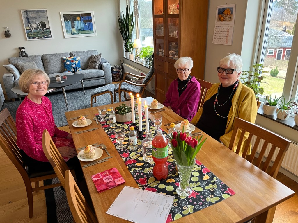 Ikväll var vi samlade hos Åsa i Tenhult. Hon fyller 65 år imorgon och hade förberett en massa gott att äta. Vi åt och mumsade i oss av allt hon satte fram. Först bjöd hon på en jättegod middag och sen blev det kaffe, kakor och tårta. Jag njöt i fulla drag.