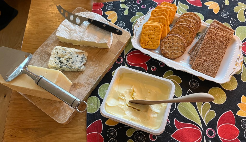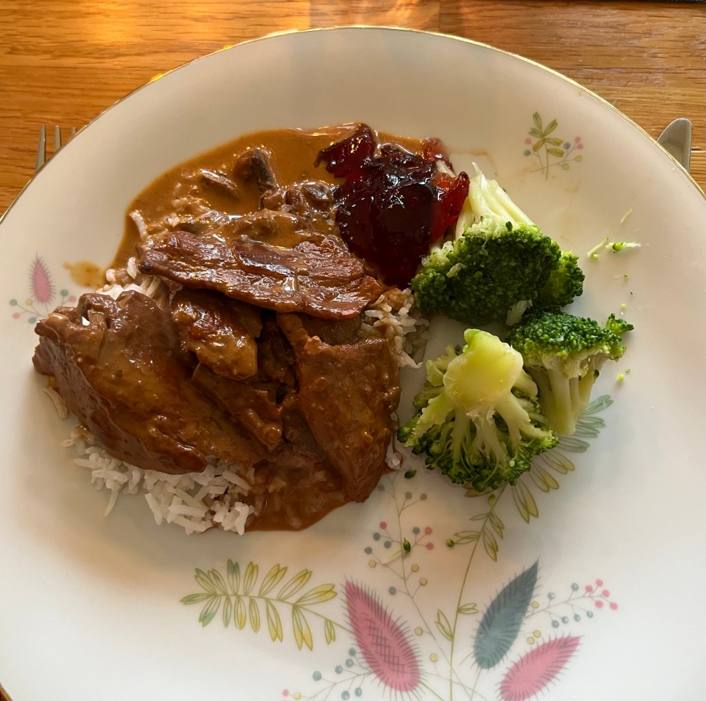 Till huvudrätt serverades Himmelska grytan med ris, broccoli och gelé och därefter kex och ost.