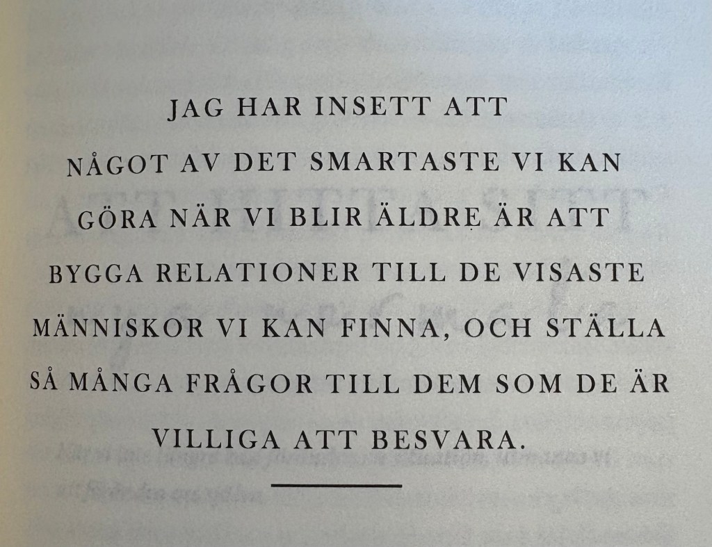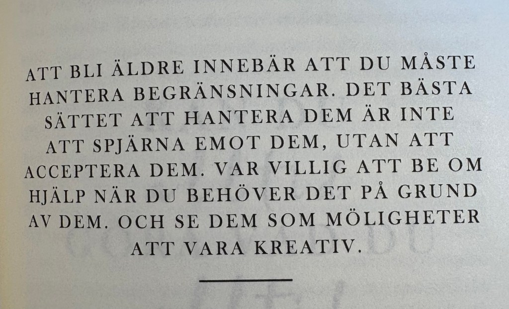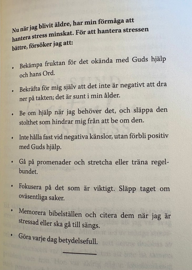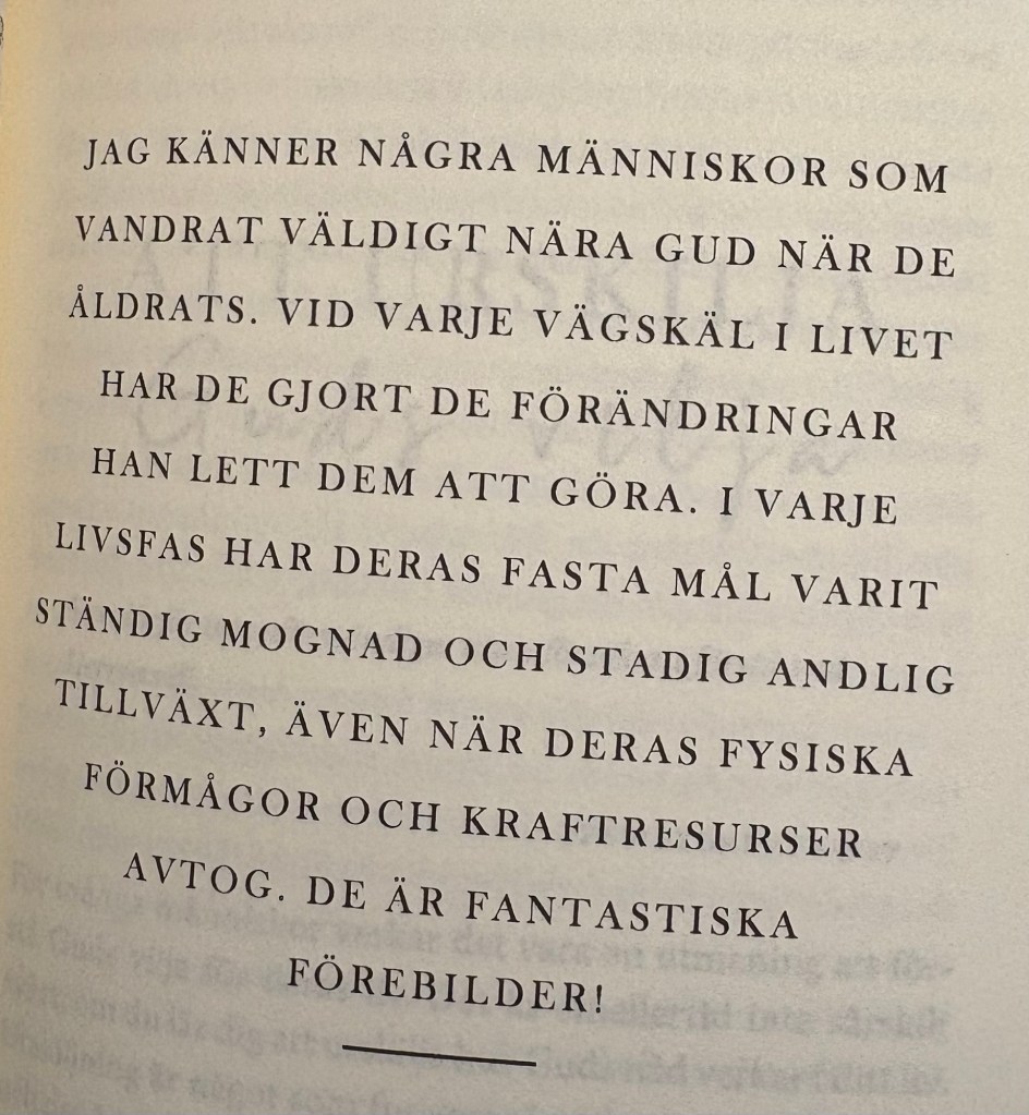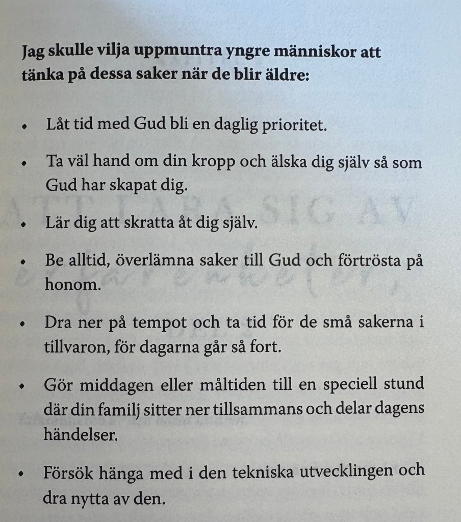 Jag gav henne bl a en bok med titeln ”Åldras utan att bli gammal” av Joyce Meyer. Det kanske låter märkligt men jag tror det ligger något i det. Visst är det fint att bli gammal och gamla kommer vi att bli om vi får leva. När jag skumläste lite i boken innan jag köpte den märkte jag att där fanns en massa fina livsråd hur vi ändå ska kunna hålla oss så fräscha det går till ande, kropp och själ. Jag fotograferade några sidor i boken idag och delar dem här. Kanske någon blir uppmuntrad, inspirerad och välsignad av dessa råd.