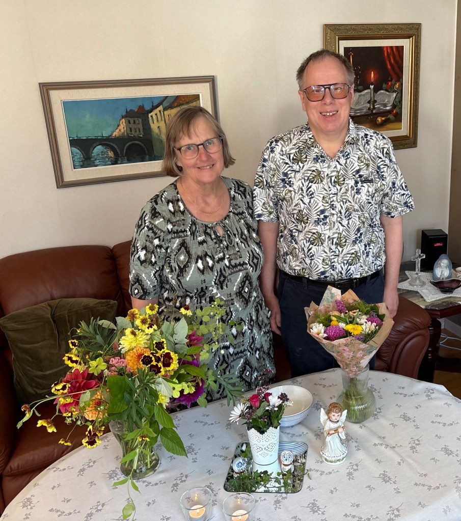 Min kära vän Monica har fyllt 70 år men jag och några med mig hade inte möjlighet att vara med på hennes stora härliga fest. Vi blev istället bjudna idag. Det blev en jättefin dag i goda vänners lag. Hon har bjudit på mycket gott att äta och vi har njutit i fulla drag av härlig gemenskap, trevlig tipsrunda, goda samtal och smaskig kaka och tårta. Nedan ser vi henne tillsammans med make Willy.