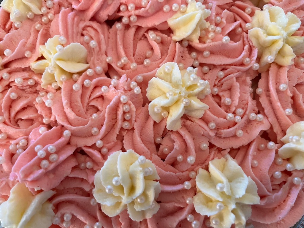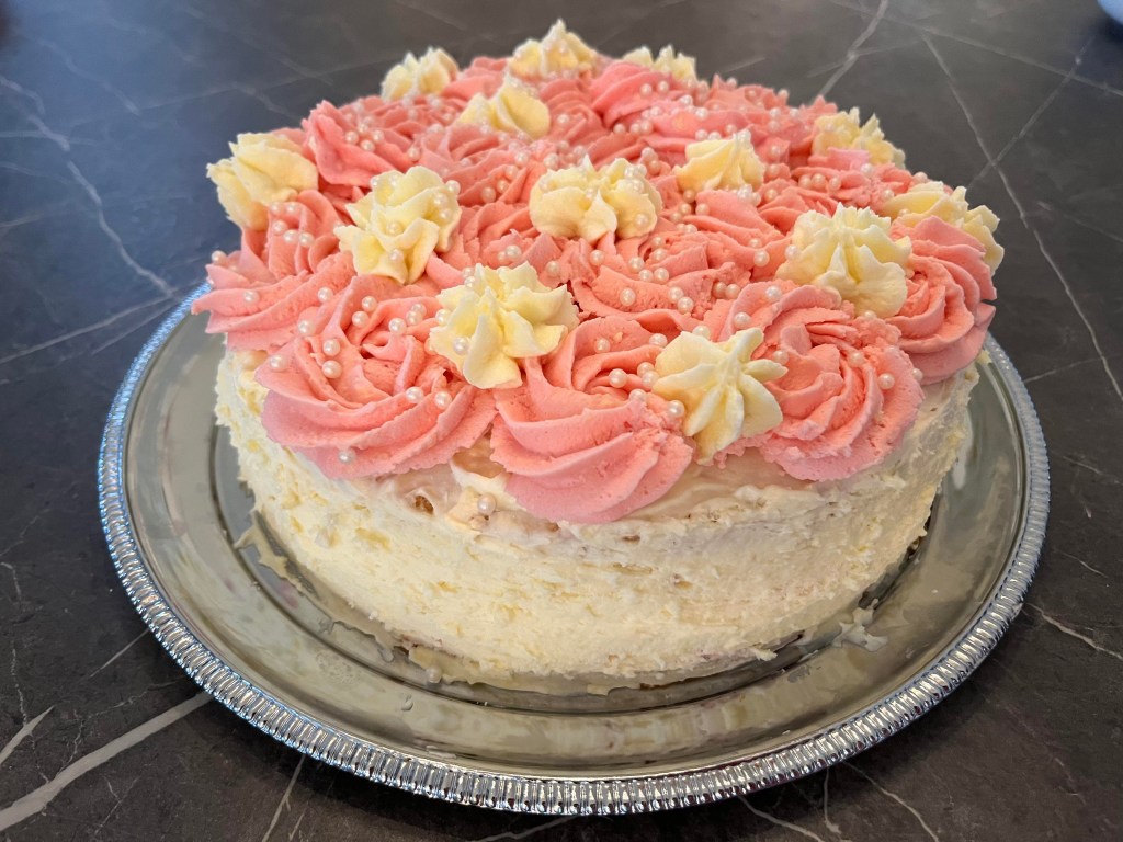 Jag bakade tårtan och fixade mellanläggen igår kväll och idag på morgonen garnerade jag den. Det är en Catarinatårta och den är väldigt rolig att göra. Det är många olika moment men den blir både god och fin. Jag tror det är fjärde gången jag gör denna tårta. Om du vill ha receptet så hittar du det här: https://www.koket.se/catarinatarta