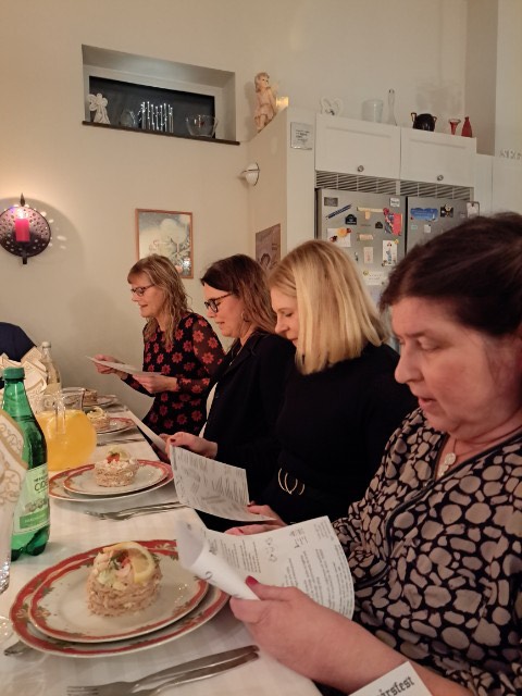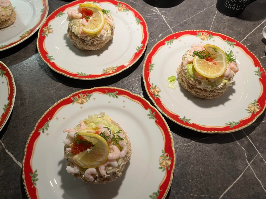 Till förrätt serverades räkbakelser. Vi passade på att sjunga en välkomstvisa och hålla ett positivt tal till oss själva.