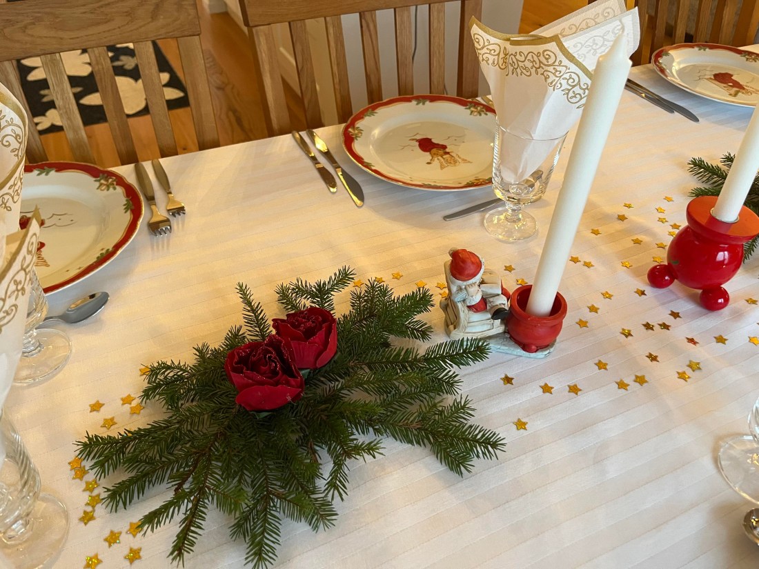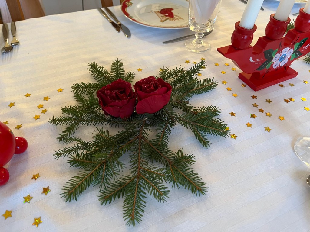 Jag har firat in det nya året med ett gäng goa glada vänner här hos mig på Tallkullen. Det är verkligen roligt att förbereda för fest när man har gott om tid och det har jag haft denna vecka. Jag dukade med granris, konstgjorda röda rosor och guldstjärnor. Jag tycker det blev riktigt vackert om jag får säga det själv. Jag har fått känna skaparglädje på flera sätt idag vid dukning och garnering av tårta som jag visar nedan.